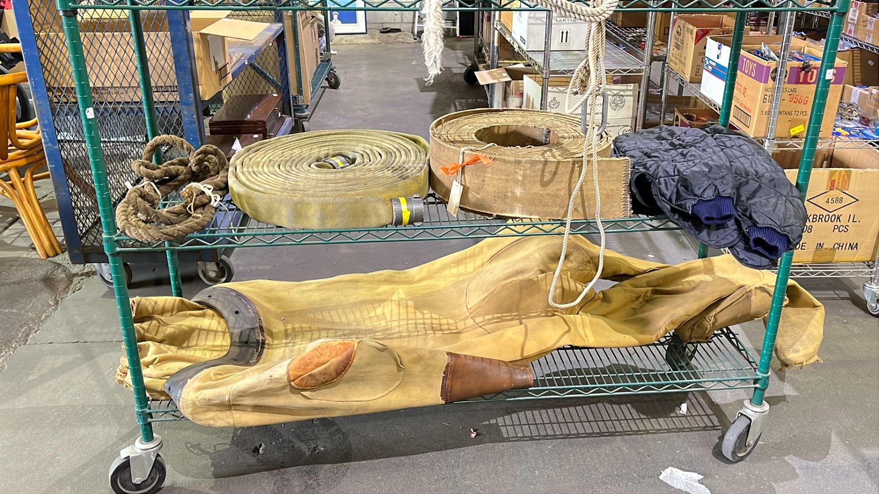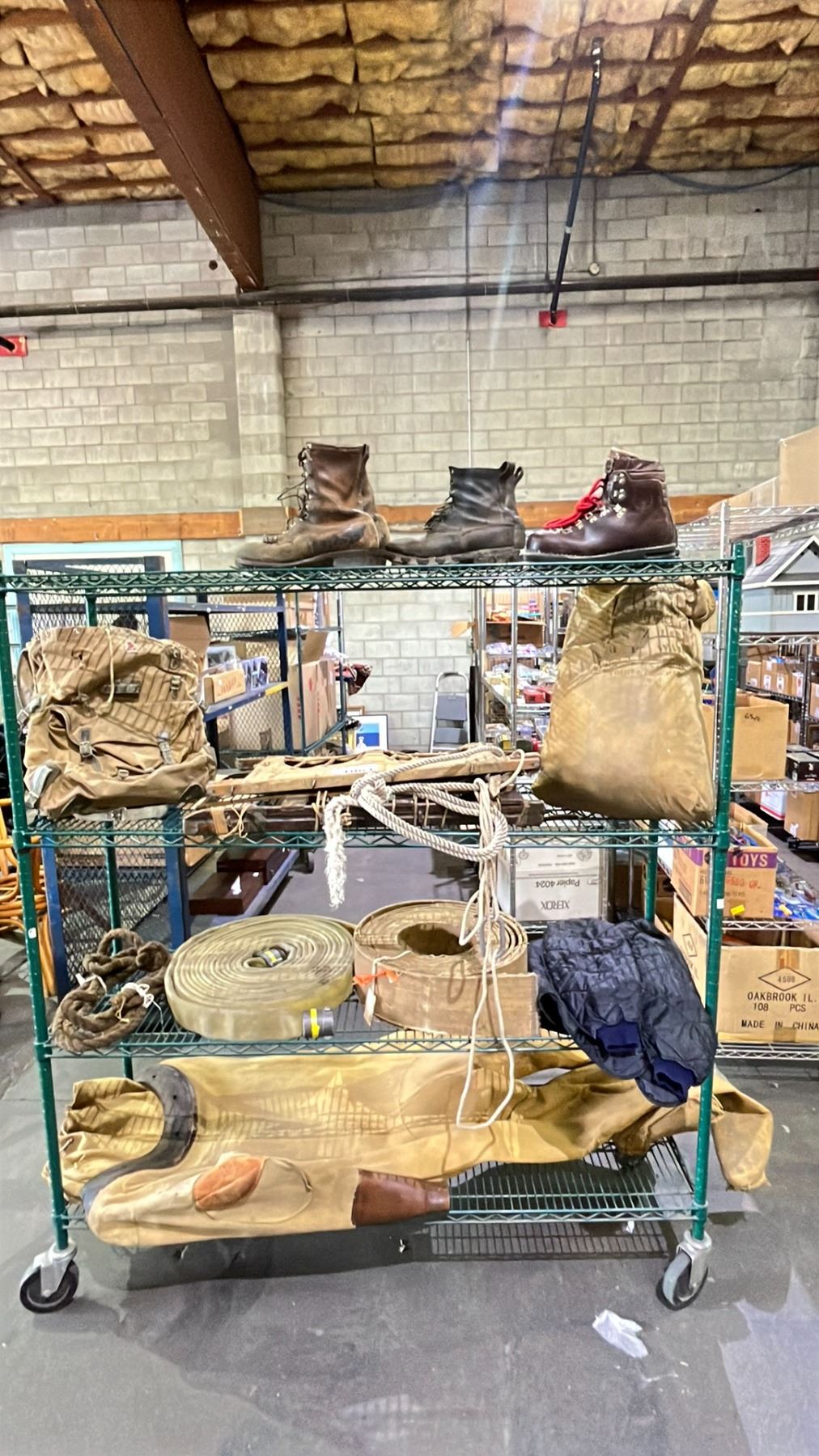 RACK OF ASSORTED ANTIQUES INCLUDING; ICE CLIMBING BOOTS, FIRE HOSE, BERG BACKPACK & MORE (RACK NOT INCLUDED)