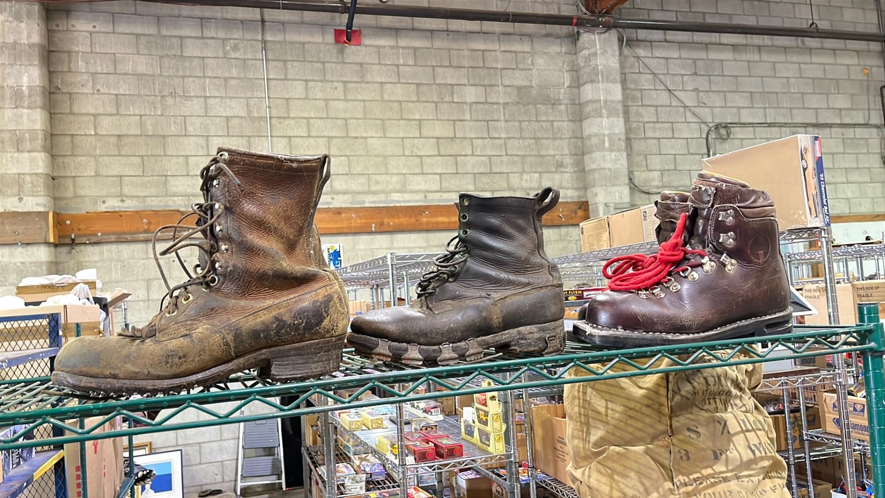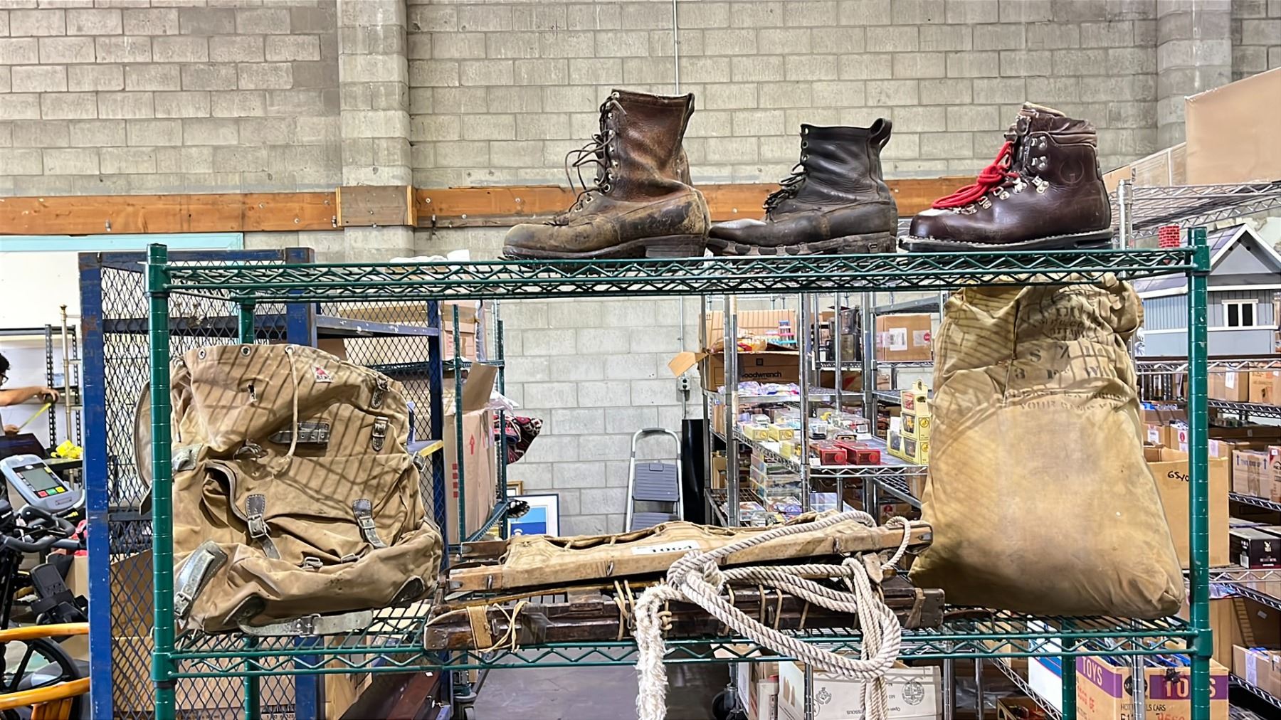 RACK OF ASSORTED ANTIQUES INCLUDING; ICE CLIMBING BOOTS, FIRE HOSE, BERG BACKPACK & MORE (RACK NOT