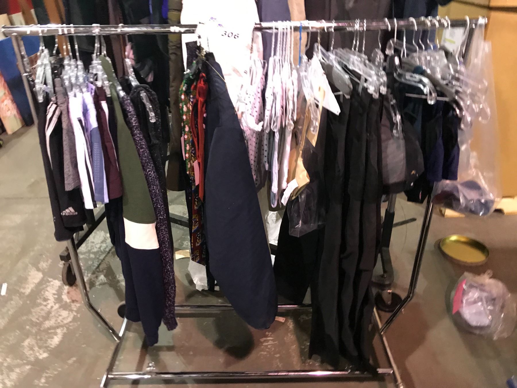 RACK OF ASSORTED CLOTHING, SHORTS, TIES, BABY ONESIES SOME NEW WITH TAGS(RACK NOT INCLUDED)