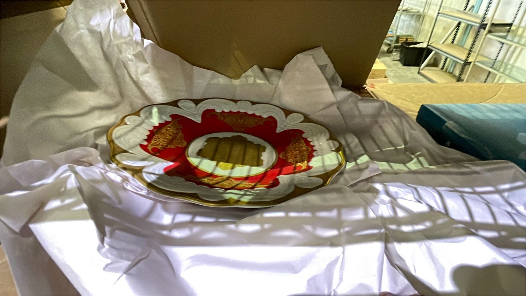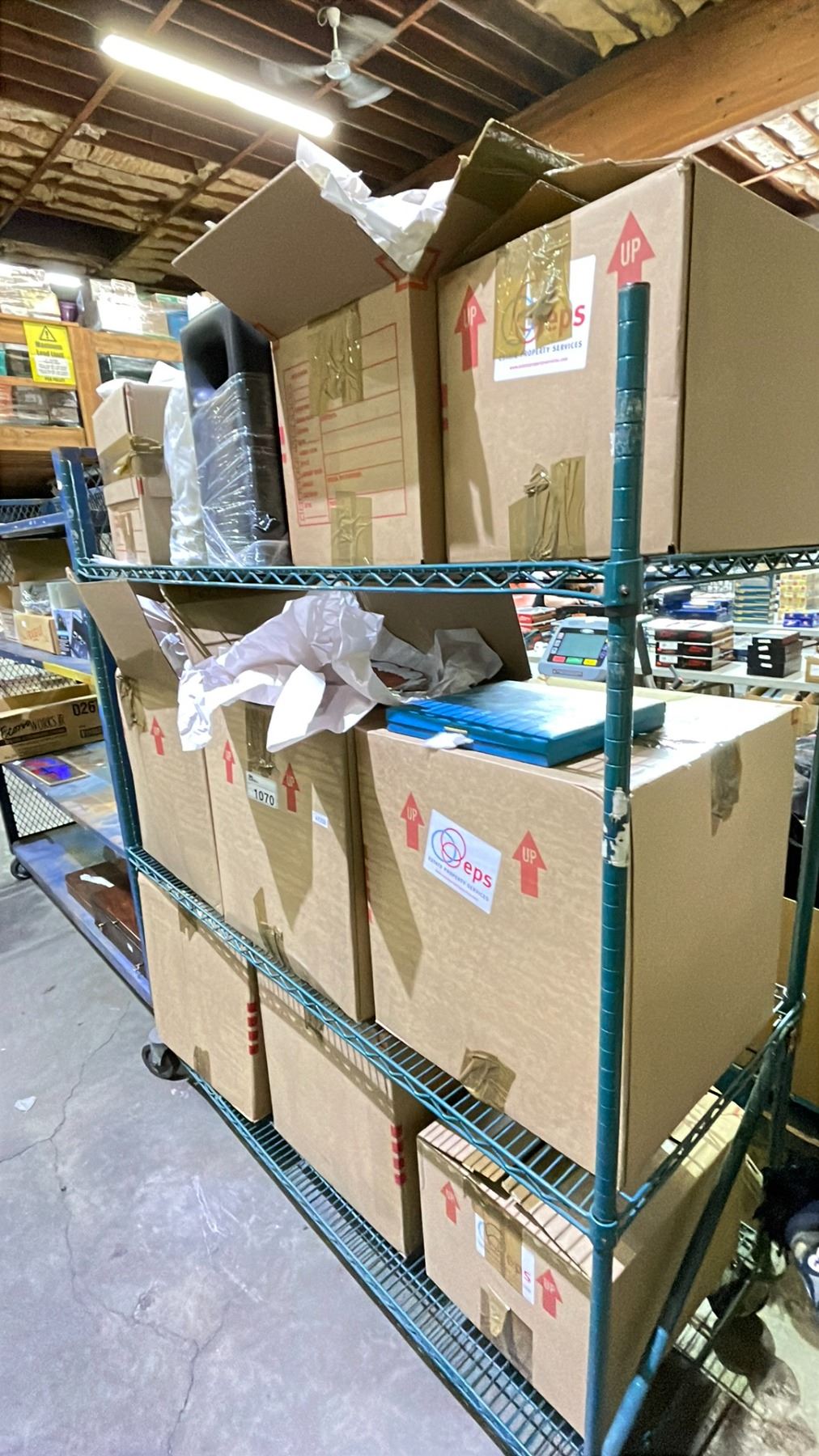 RACK OF ASSORTED ESTATE ITEMS INCLUDING; GLASSWARE, COLLECTIBLE PLATE, SUBWOOFER & MORE (RACK NOT INCLUDED)