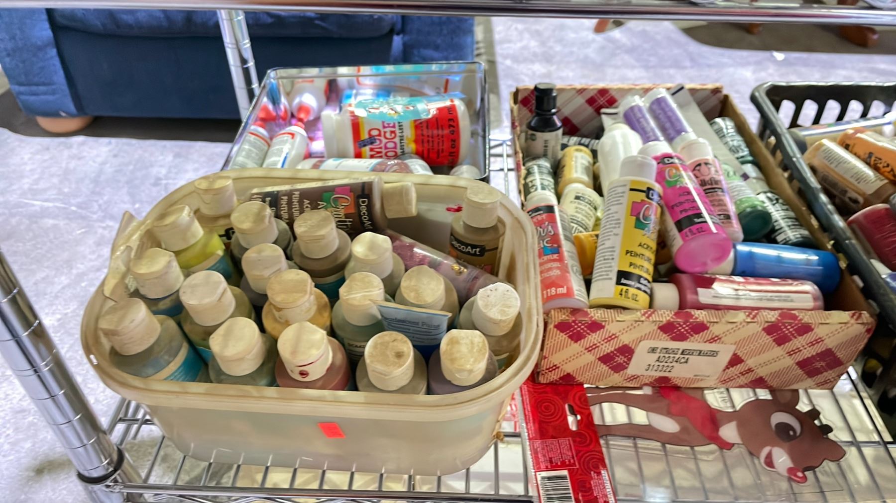 RACK OF ASSORTED HATS, MASKS & CRAFTING/ART SUPPLIES