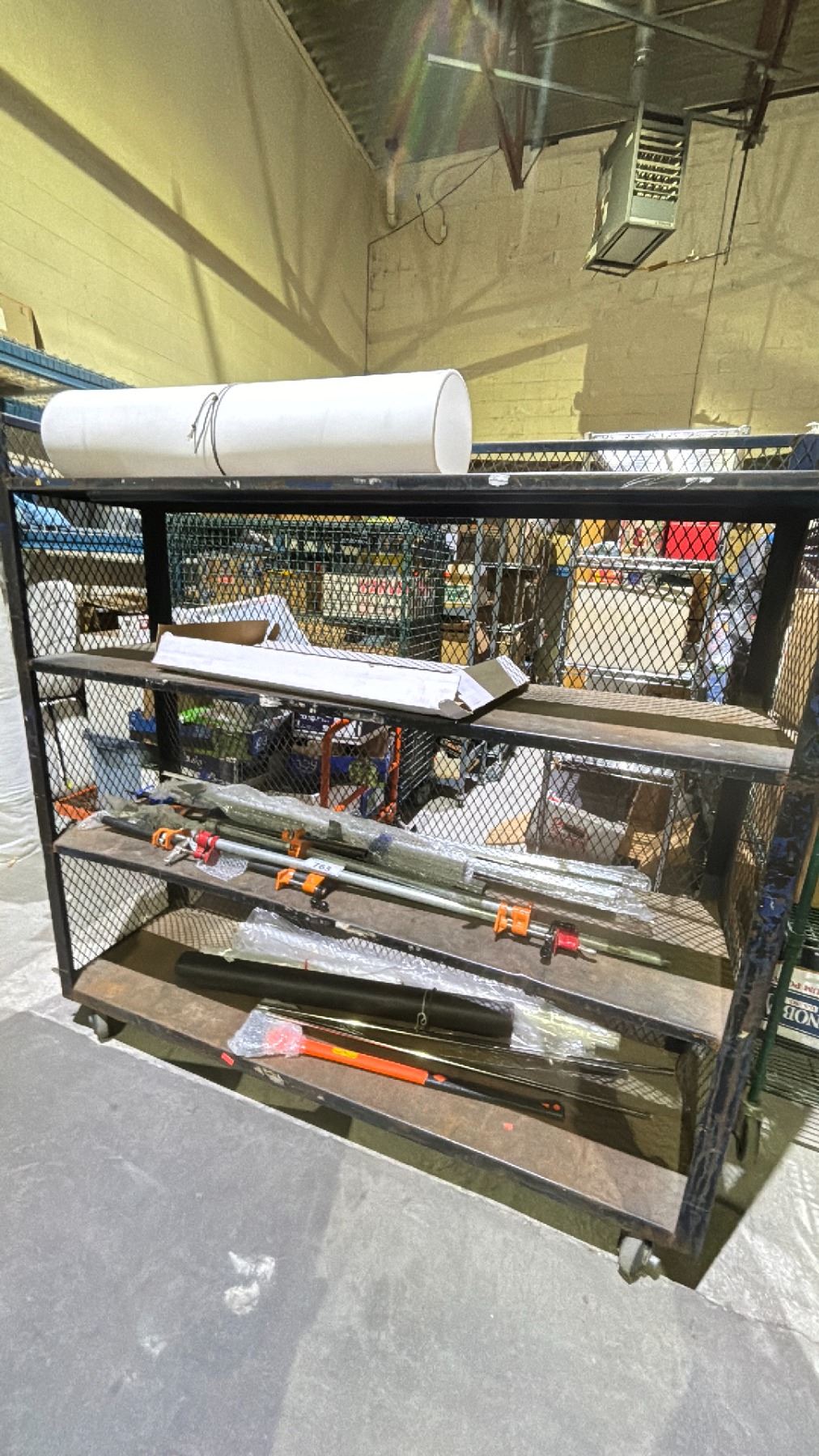 RACK OF ASSORTED ITEMS INCLUDING; FIRE AXE, WORK BENCH CLAMPS, ROLLS OF VINYL AND MORE *RACK NOT INCLUDED*