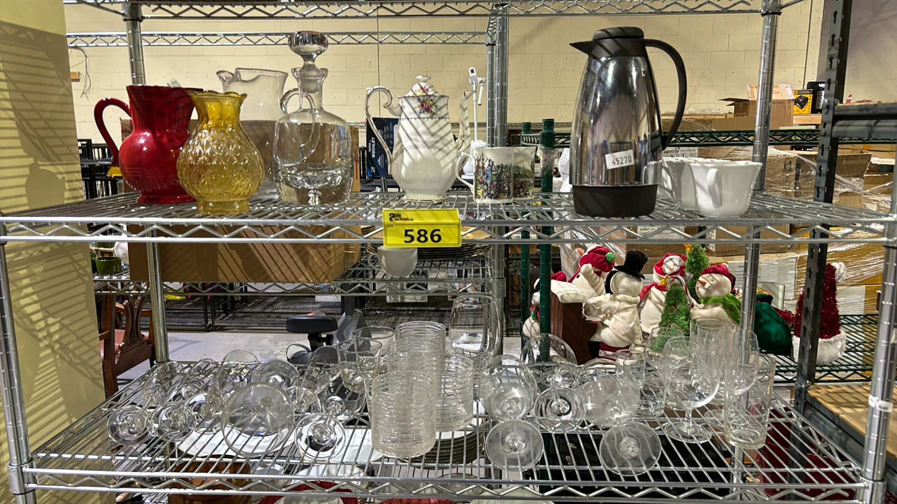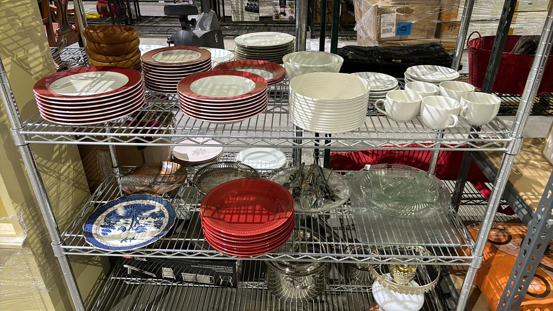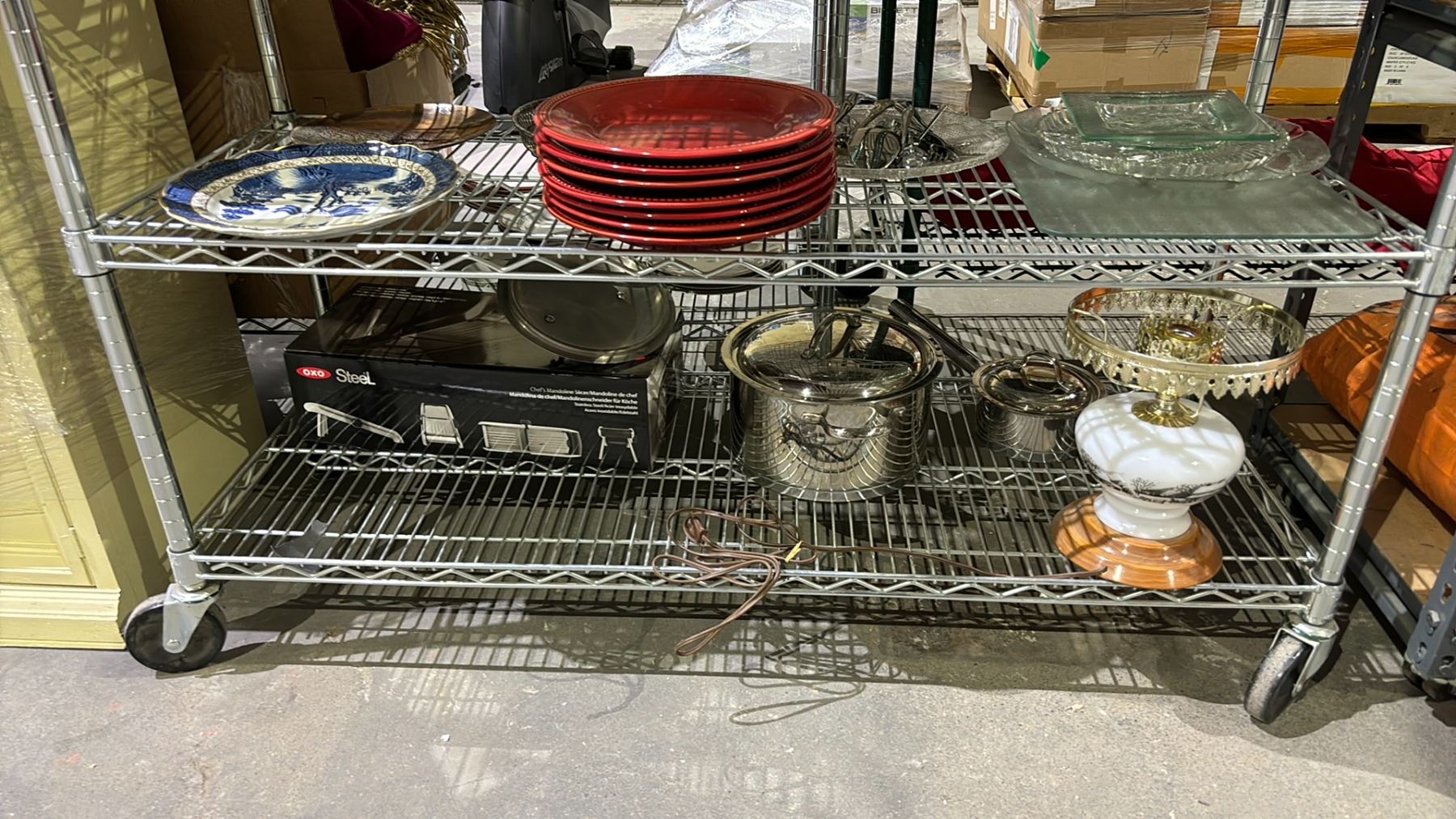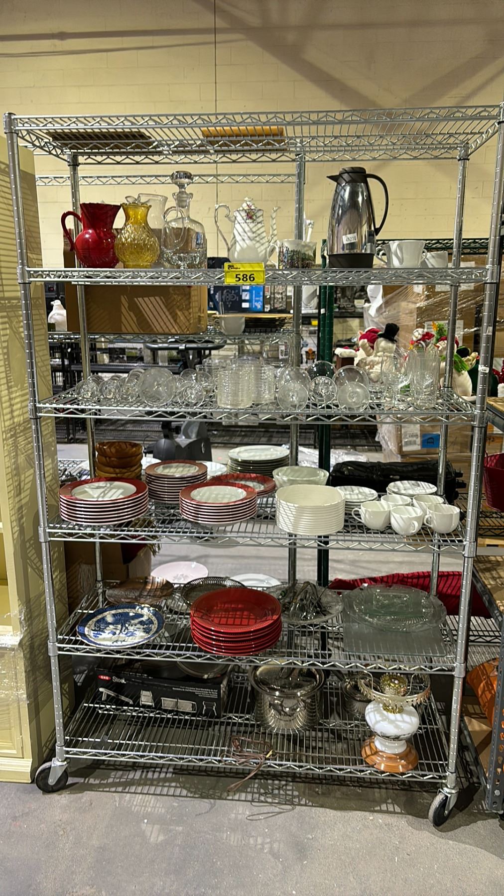 RACK OF ASSORTED PLATES, WINE GLASSES, WOODEN BOWLS, VASES AND MORE *RACK NOT INCLUDED*