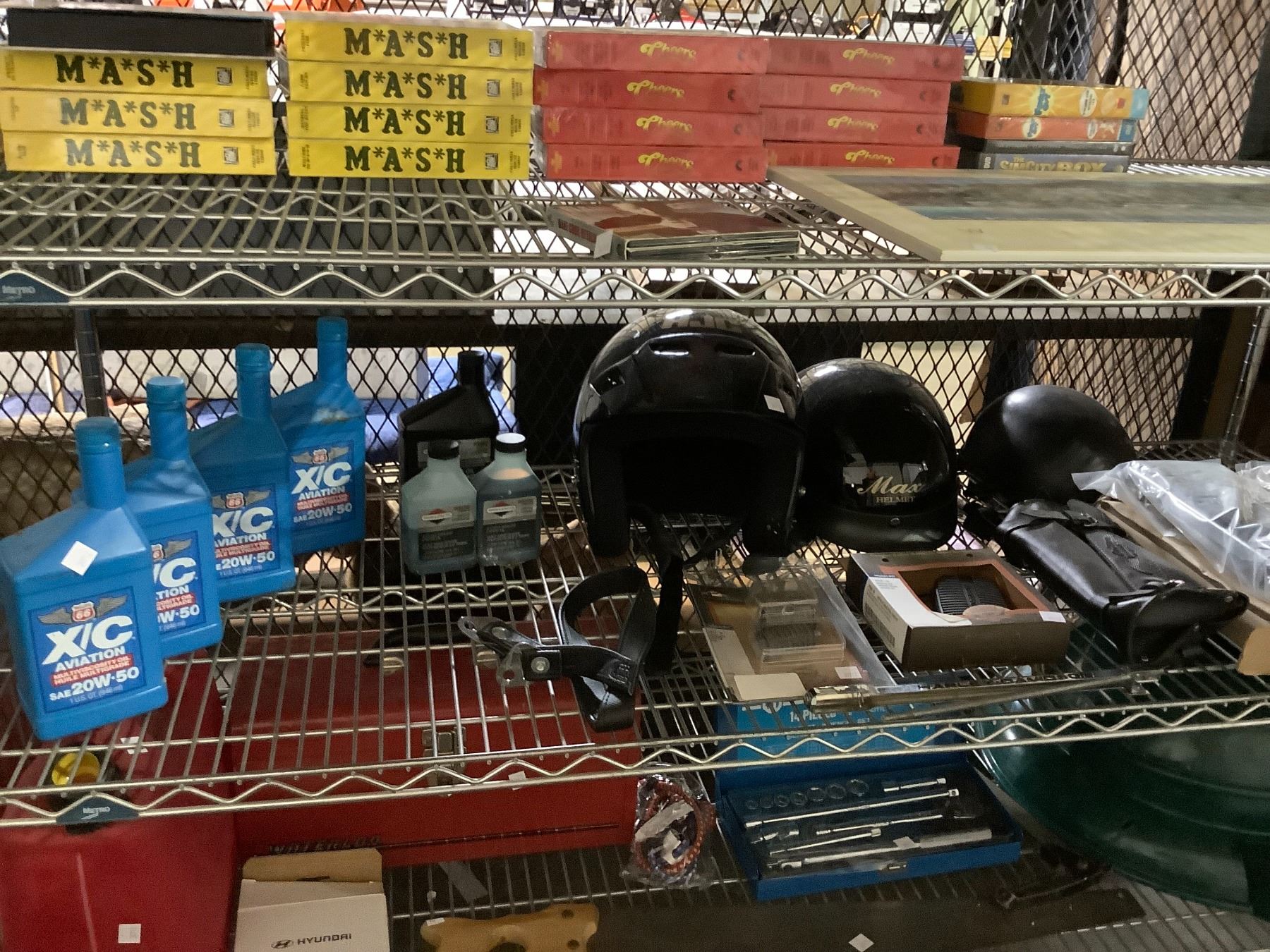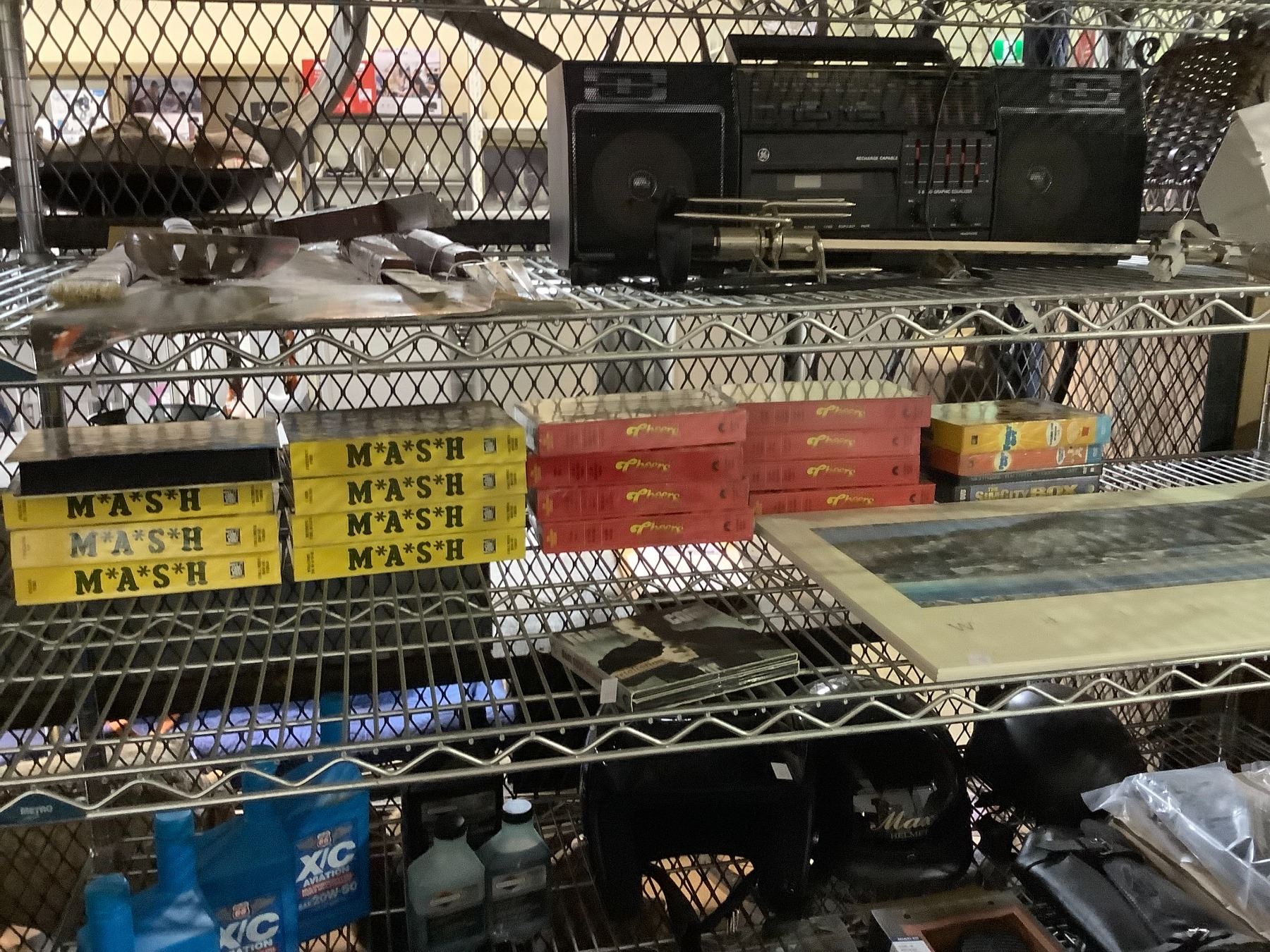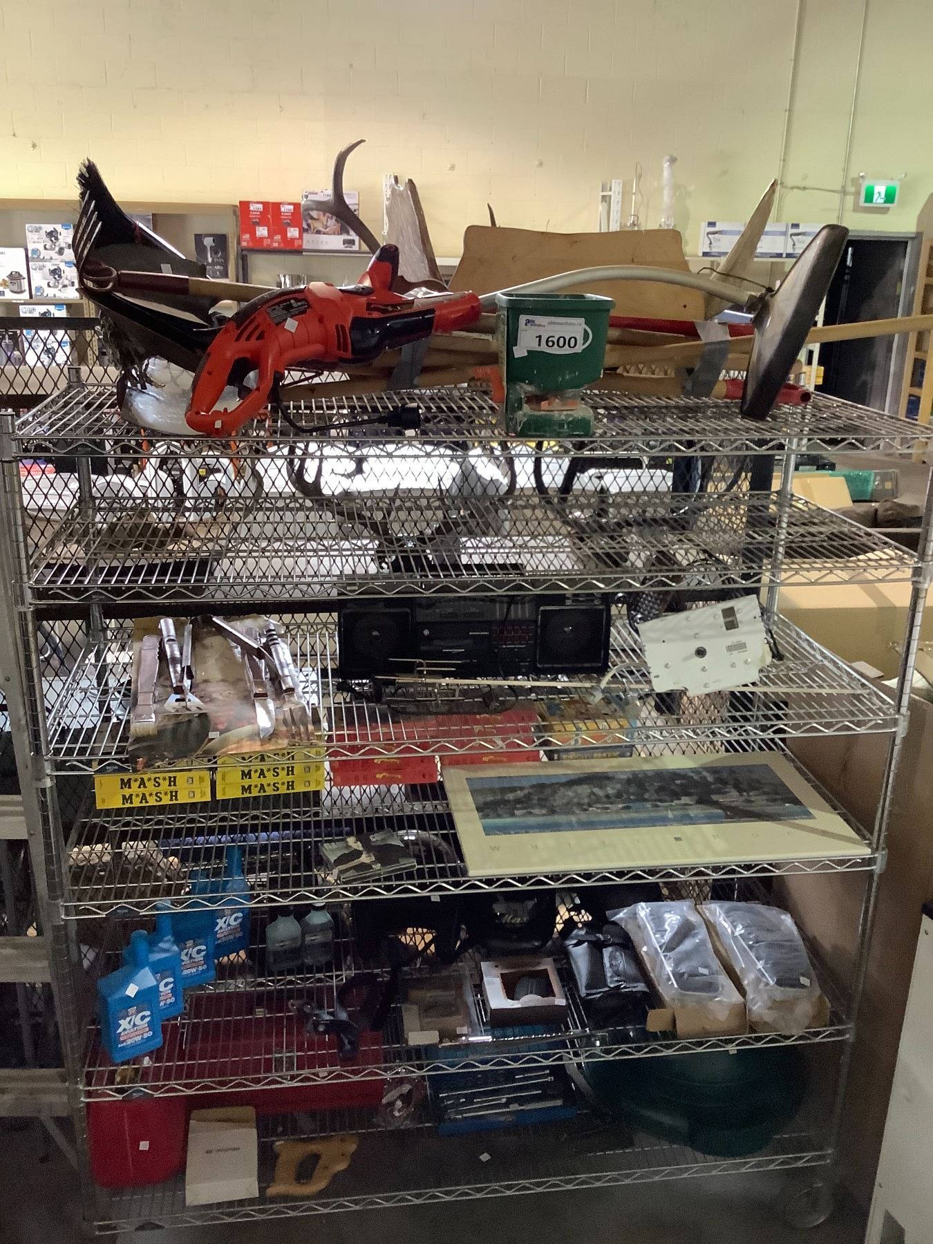 RACK OF ASSORTED TOOLS, BBQ GEAR, VHS, TOOLBOXES AND MORE (RACK NOT INCLUDED)