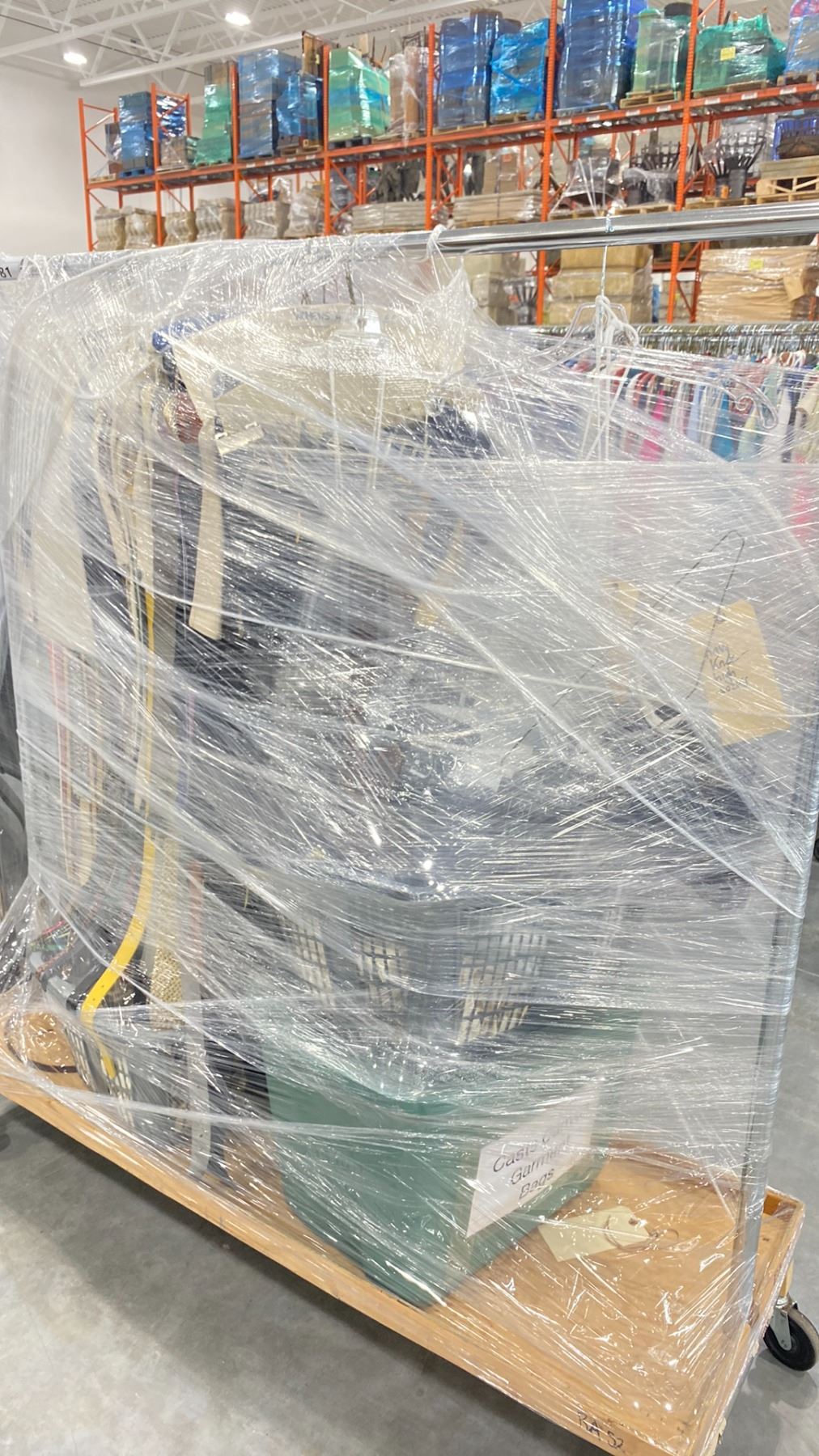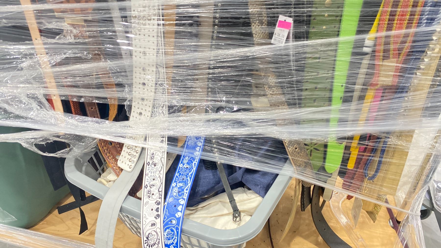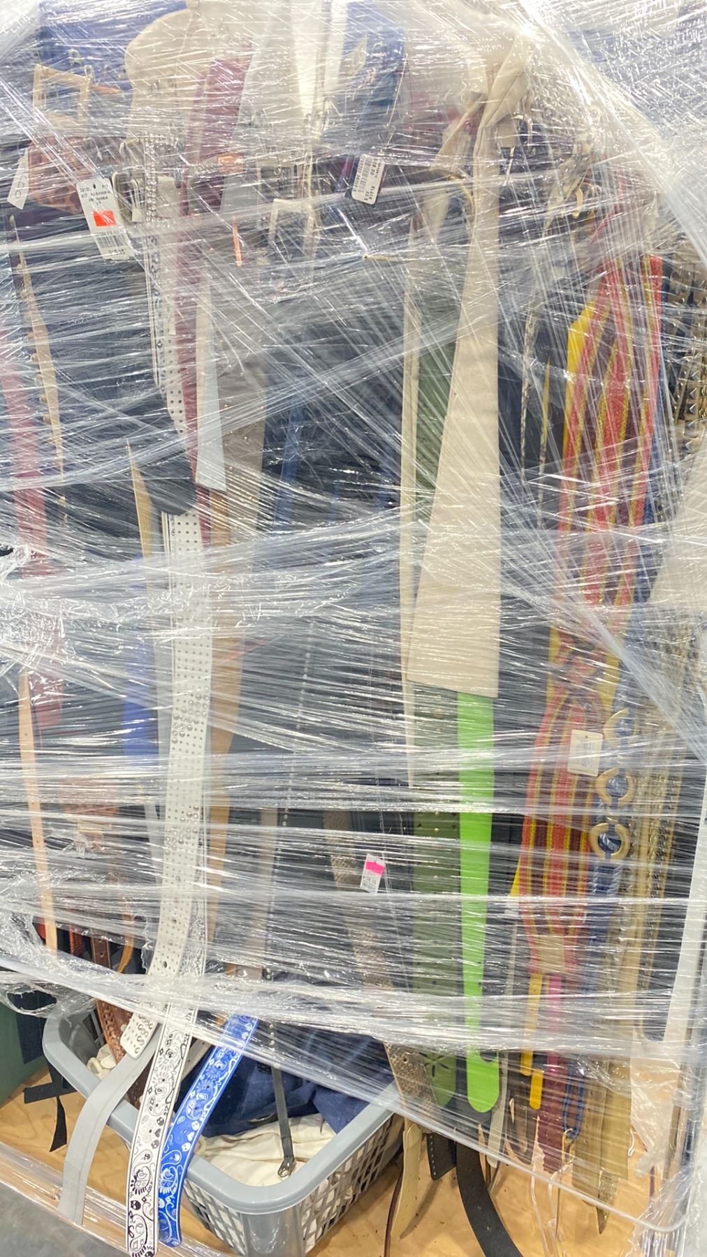 RACK OF ASSORTED WARDROBE BELTS & CANVAS GARMENT BAGS