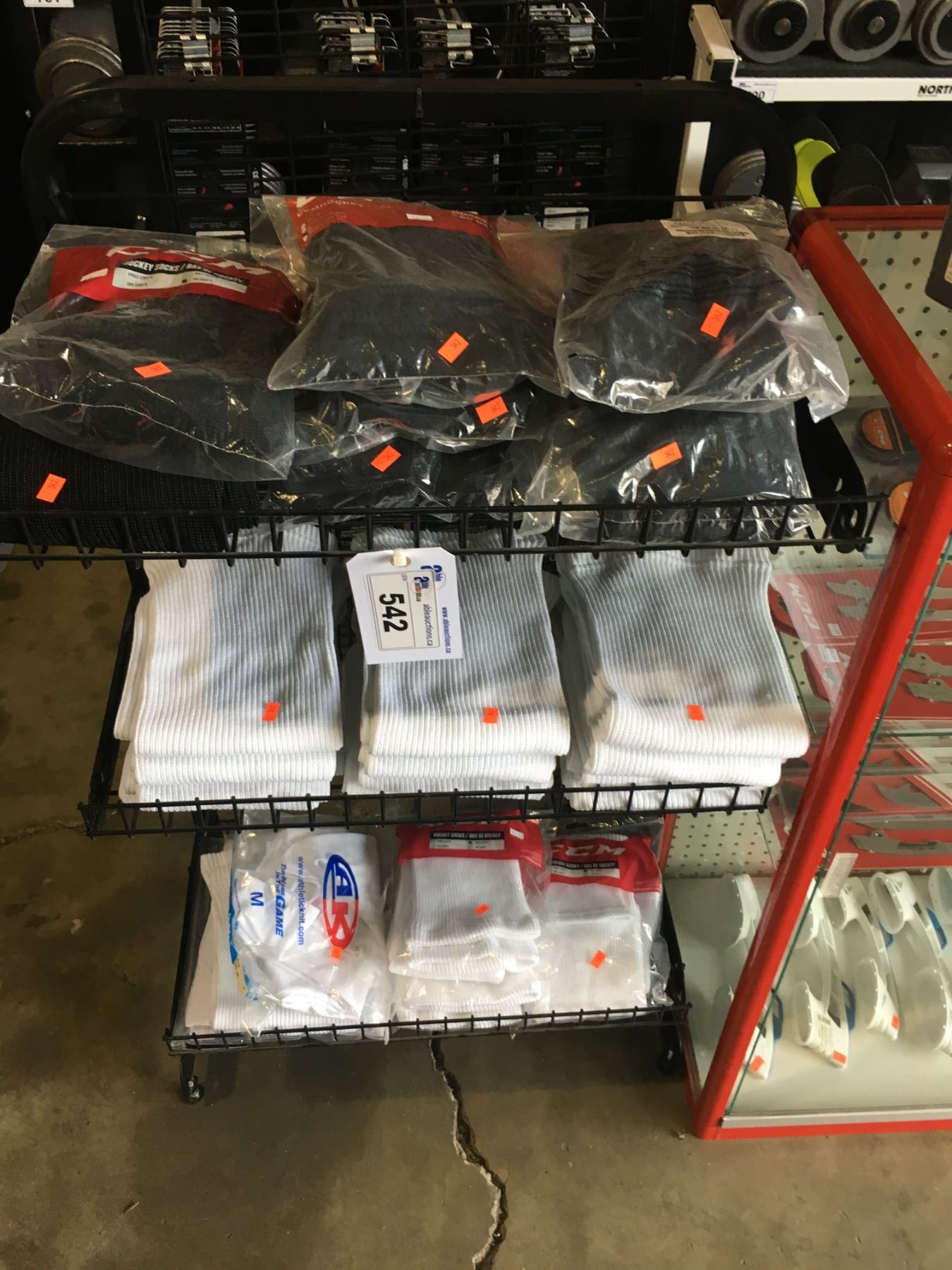 RACK OF CCM ASSORTED BLACK AND WHITE HOCKEY SOCKS (RACK INCLUDED)