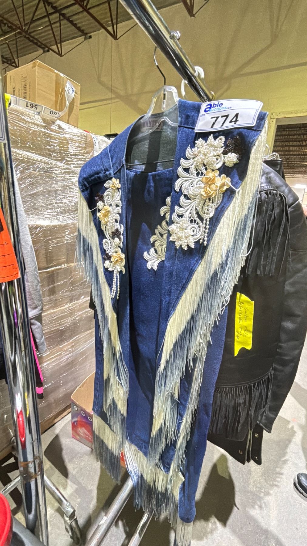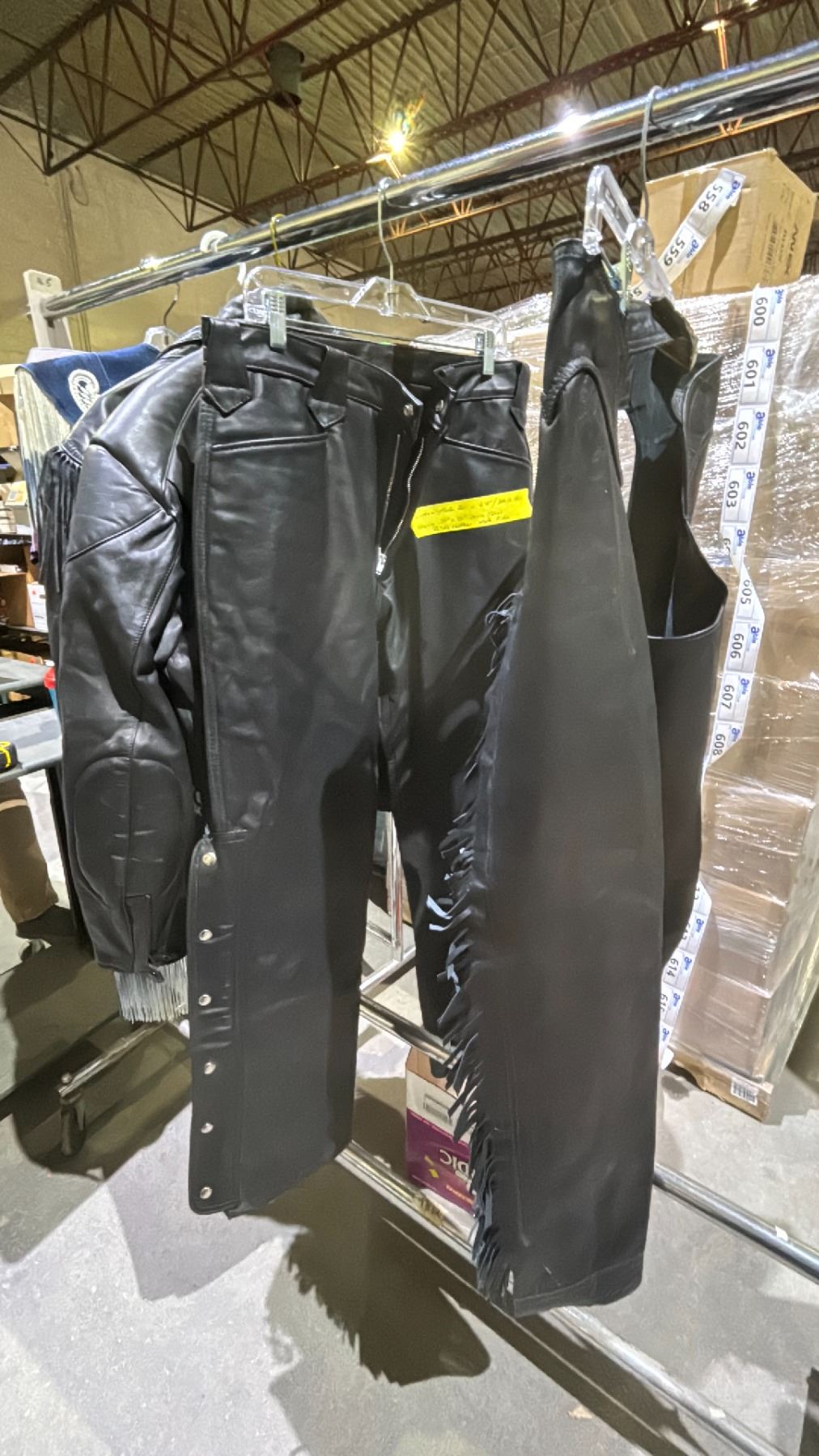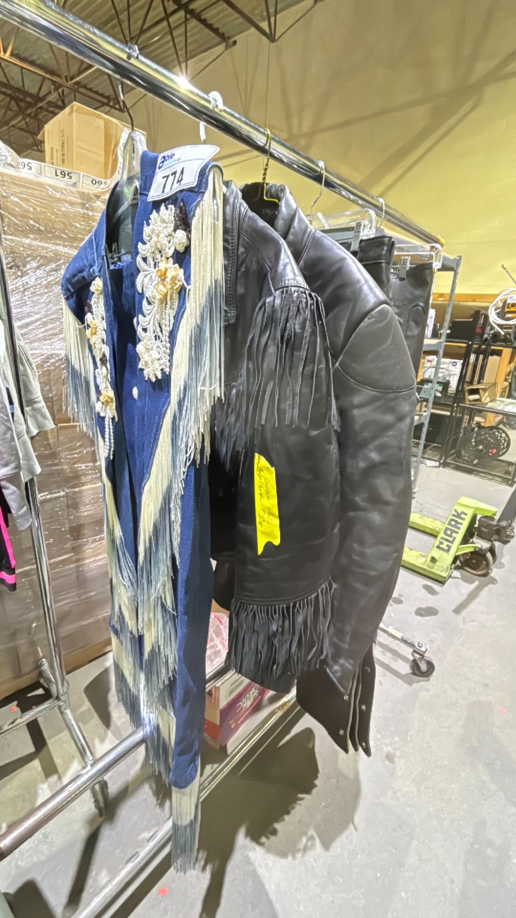 RACK OF LEATHER JACKET, LEATHER PANTS AND DENIM SKIRT