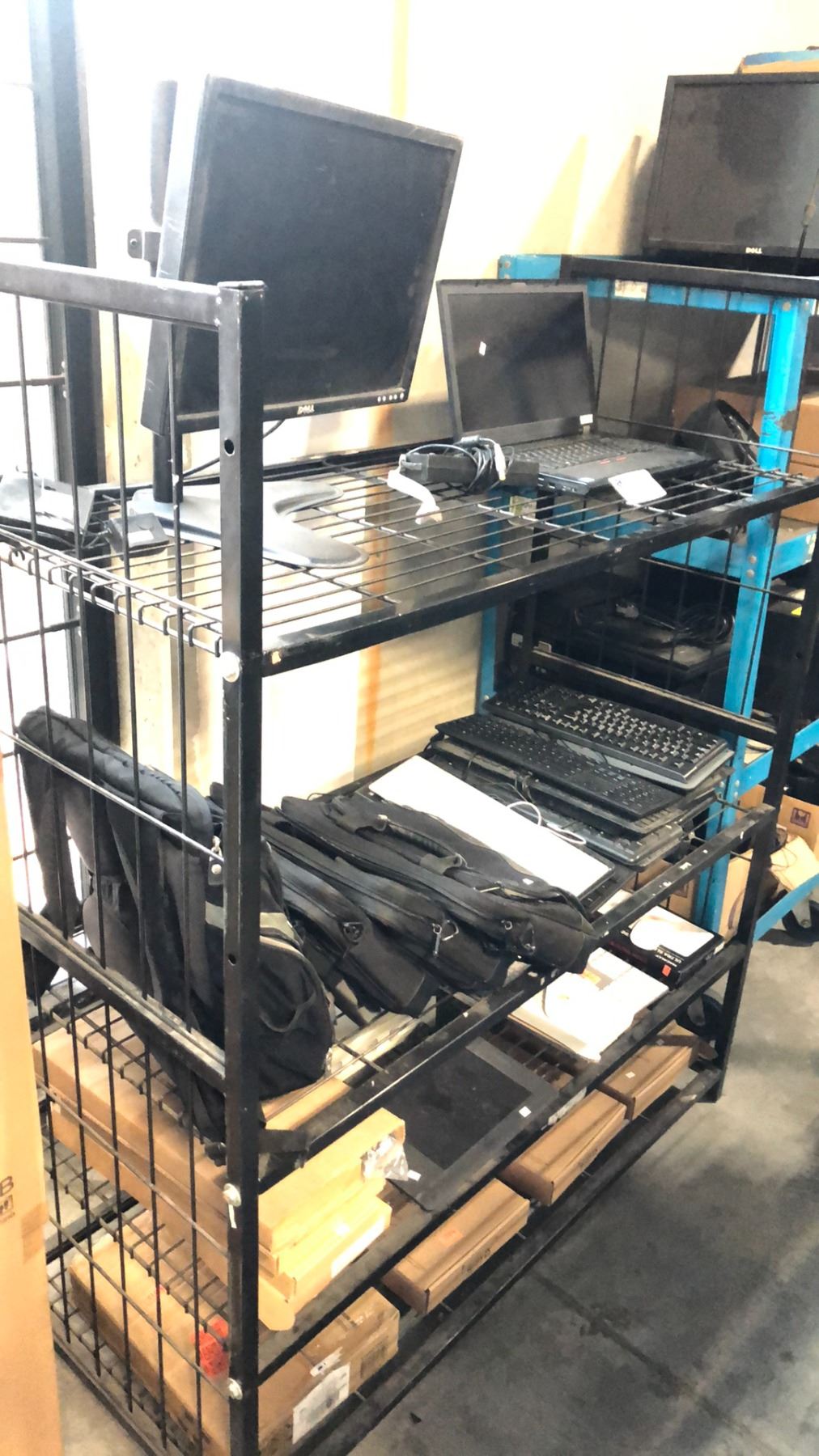 RACK OF MISC ITEMS INCL LENOVO W530 W/ POWER SUPPLY, COMPUTER MONITOR, 12 KEYBOARDS, 4 LAPTOP