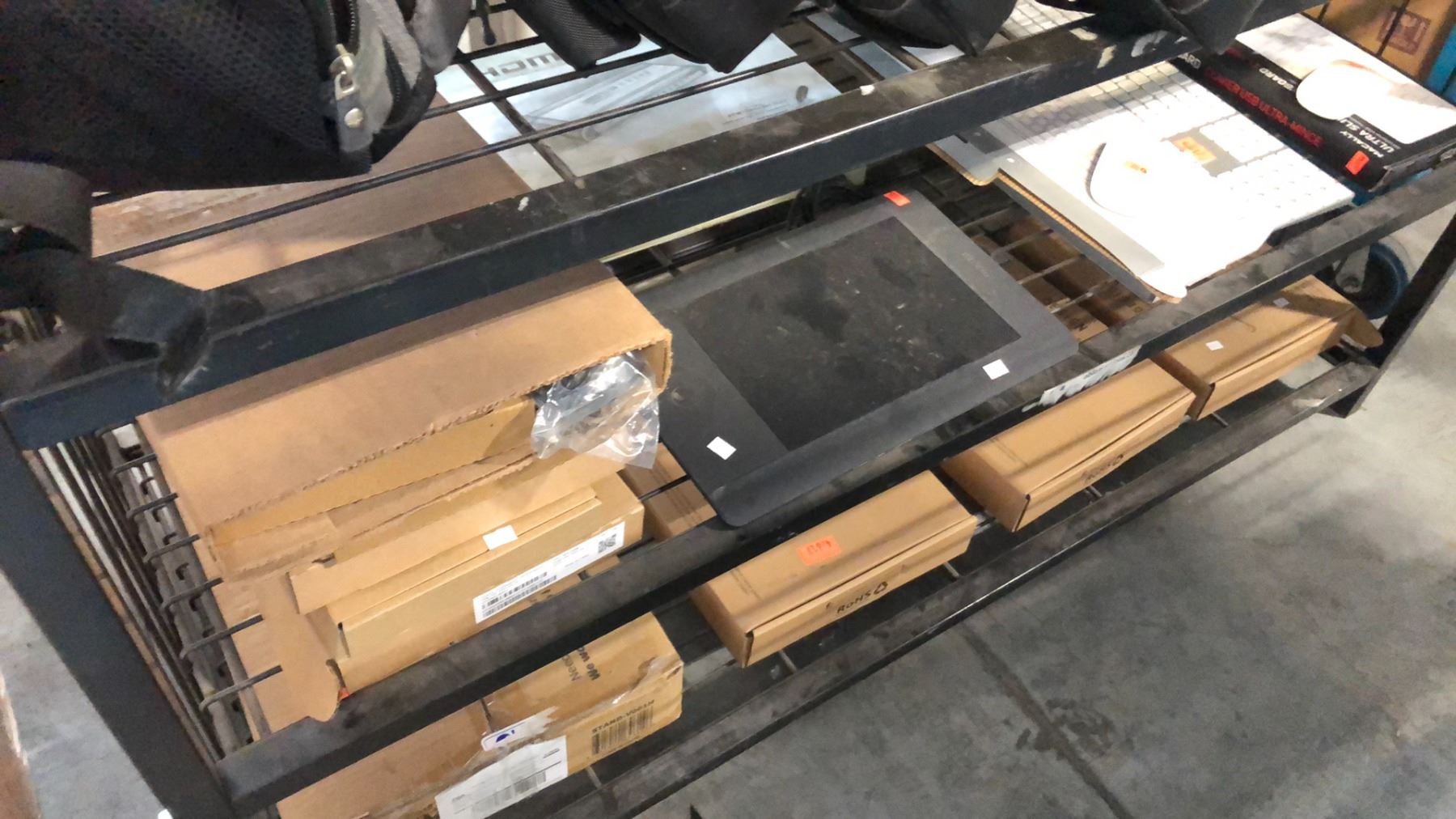 RACK OF MISC ITEMS INCL LENOVO W530 W/ POWER SUPPLY, COMPUTER MONITOR, 12 KEYBOARDS, 4 LAPTOP BAGS, WACOM GRAPHIC TABLET, LAPTOP STANDS AND MORE-MUST TAKE ALL