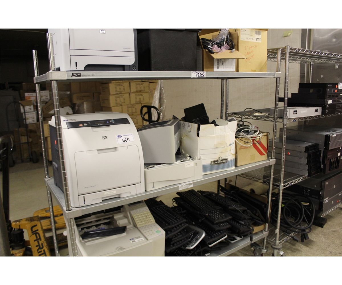 RACK OF MISC. NETWORK AND COMPUTER EQUIPMENT. INCLUDING PRINTERS, CABLES, KEYBOARDS AND MORE