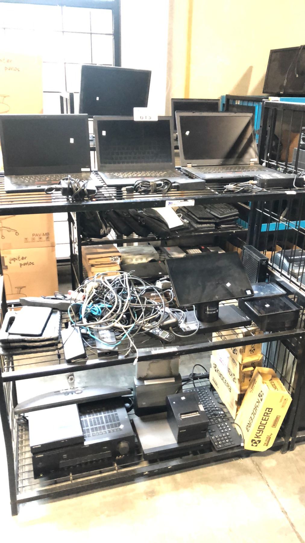 RACK OF MIXED ITEMS INCL 3 LENOVO T480, T480 AND W530 THINKPADS W/ POWER CABLE, 6 TABLETS, YAMAHA HTR-6130 5.1-CHANNEL DIGITAL HOME THEATER RECEIVER, ZMODO ZP-NE14-S 4-CHANNEL 720P HD, EPSON THERMAL PRINTER, TELEQUIP COIN DISPENSER, HIKVISION ERI-K108-P8 MODEL OF 8-CHANNEL NETWORK VIDEO RECORDER (NVR), HP TPC-IO27D ENGAGE ONE ALL-IN-ONE POS SYSTEM AND MORE - RACK NOT INCLUDE - MUST TAKE ALL