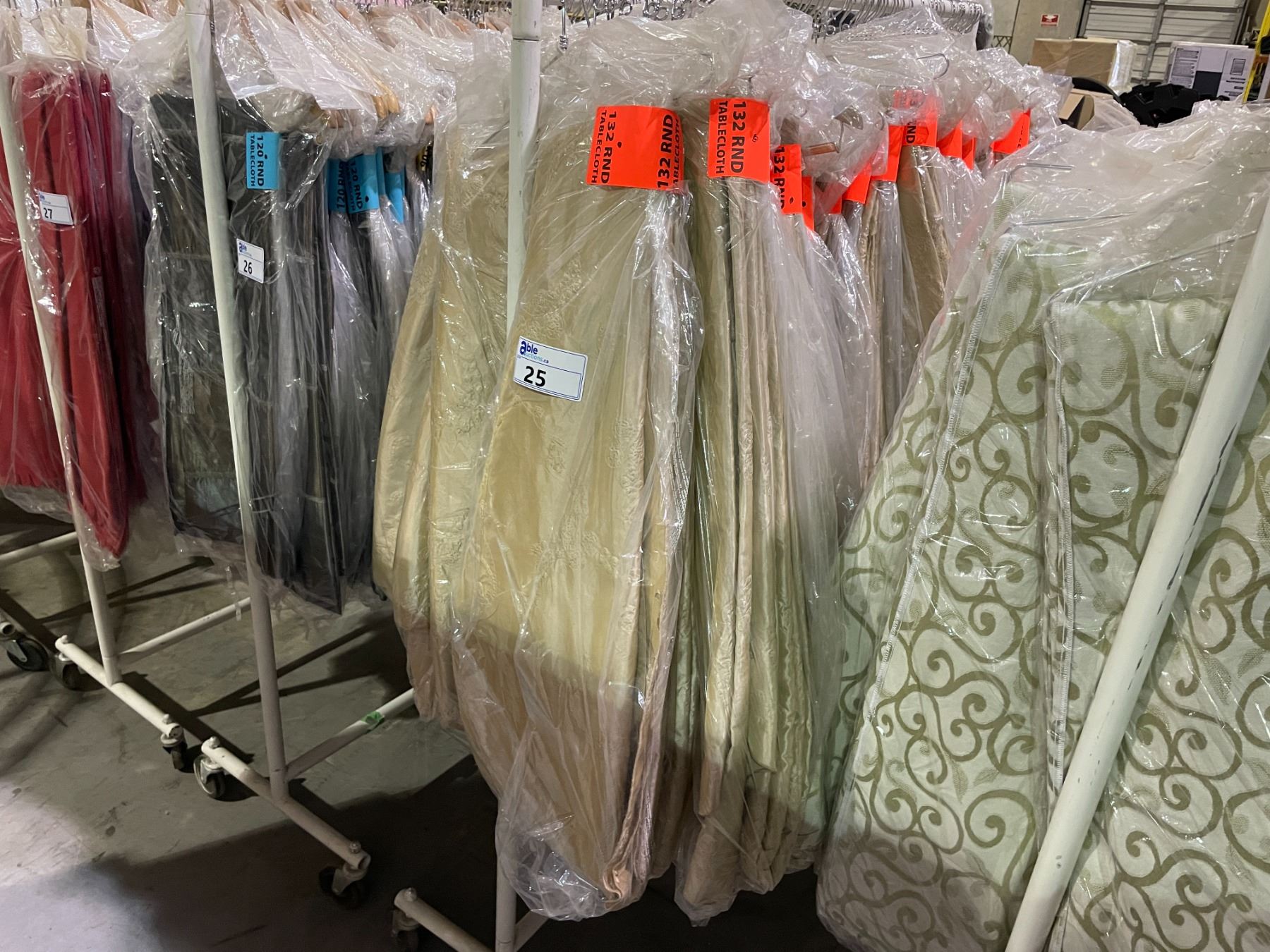 RACK OF VARIOUS DECORATIVE EVENT TABLE CLOTHS *ROLLING RACK NOT INCLUDED*