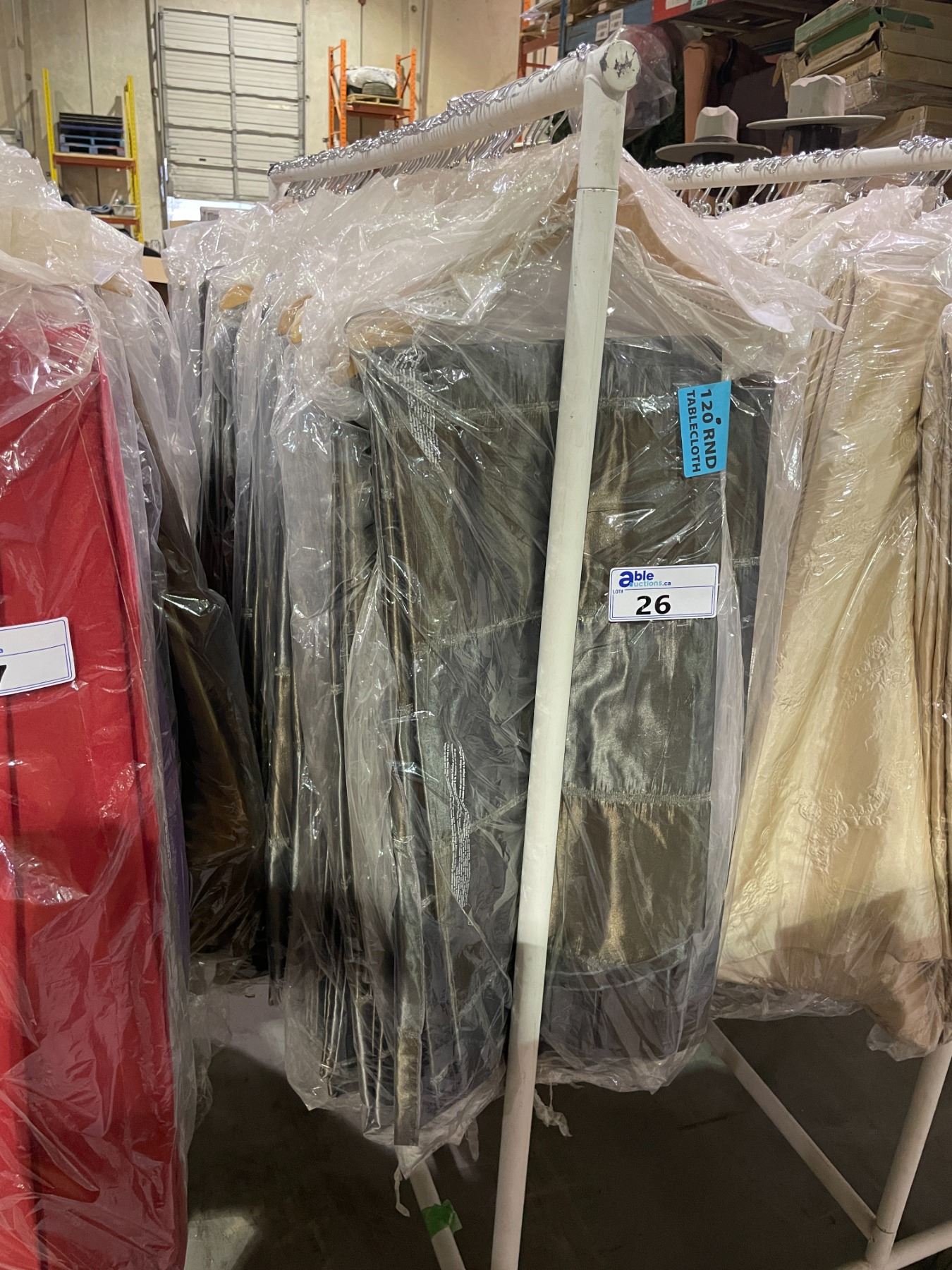 RACK OF VARIOUS DECORATIVE EVENT TABLE CLOTHS *ROLLING RACK NOT INCLUDED*