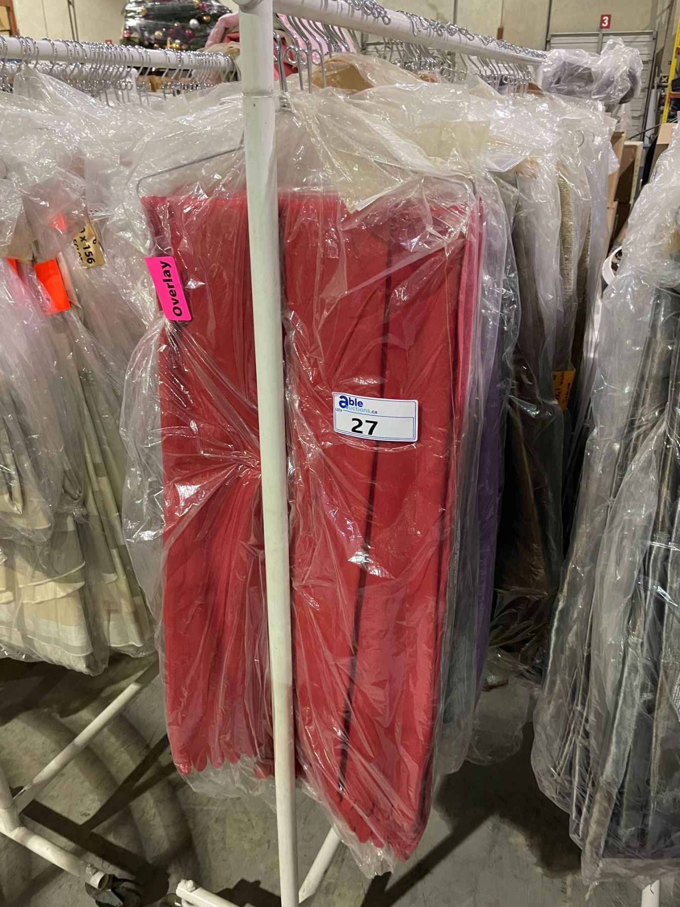 RACK OF VARIOUS DECORATIVE EVENT TABLE CLOTHS *ROLLING RACK NOT INCLUDED*