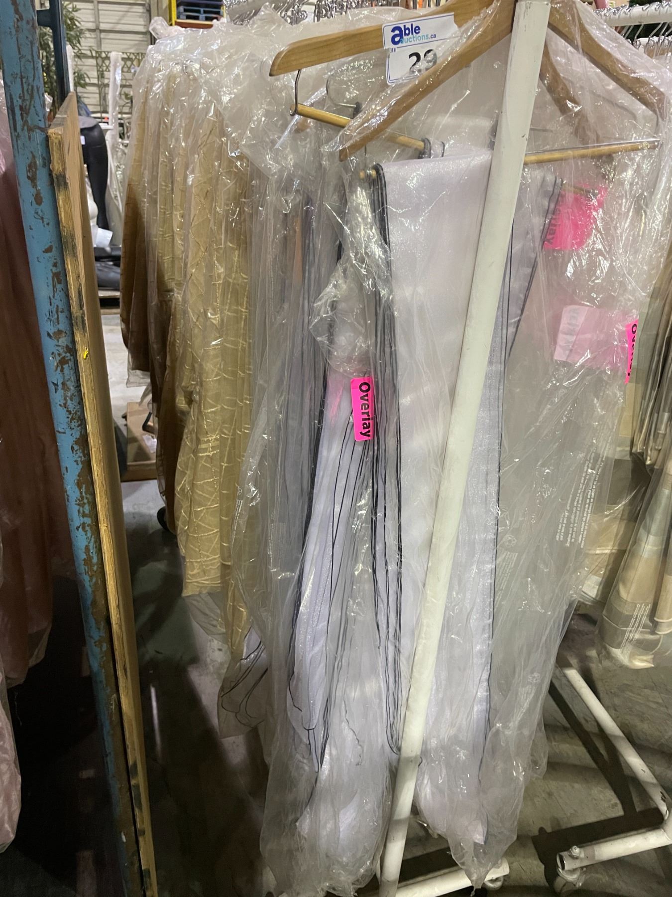 RACK OF VARIOUS DECORATIVE EVENT TABLE CLOTHS *ROLLING RACK NOT INCLUDED*