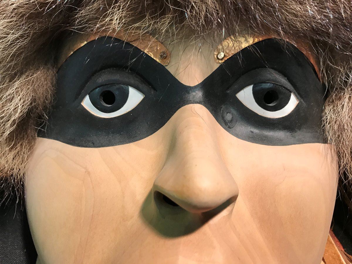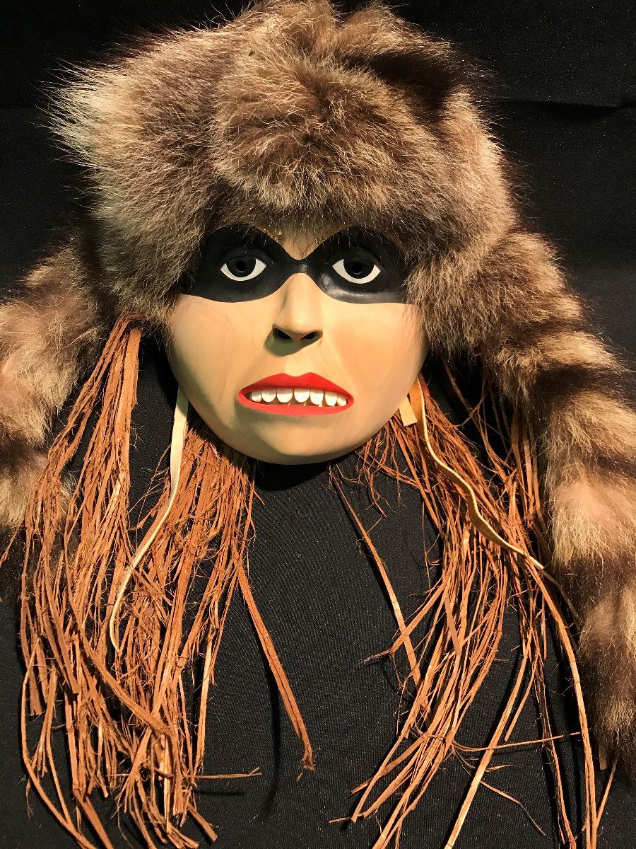 RACOON IN HUMAN FORM' MASK BY COAST SALISH MASTER CARVER STAN GREENE MASK MEASURES: 8" WIDE X 10" TALL MASK FEATURES COPPER EYEBROWS AND SHELL TEETH, THE SYMMETRY OF GRAIN ON ALL STAN GREENE'S MASKS ARE SPECTACULAR