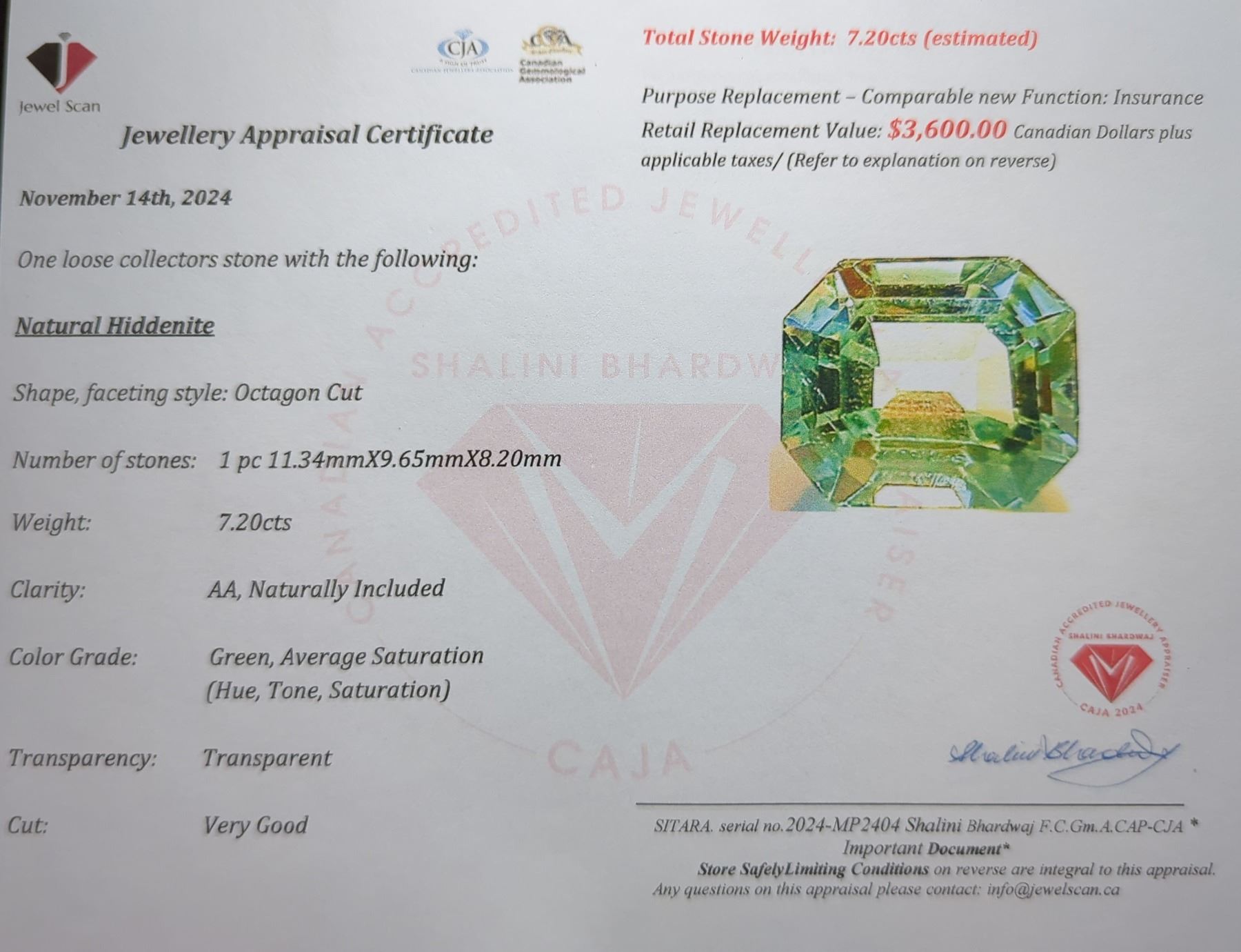 RARE - 7.2 CT CERTIFIED HIDDENITE GEMSTONE ($3,600 APPRAISAL) - **APPRAISAL NOT GUARANTEED**