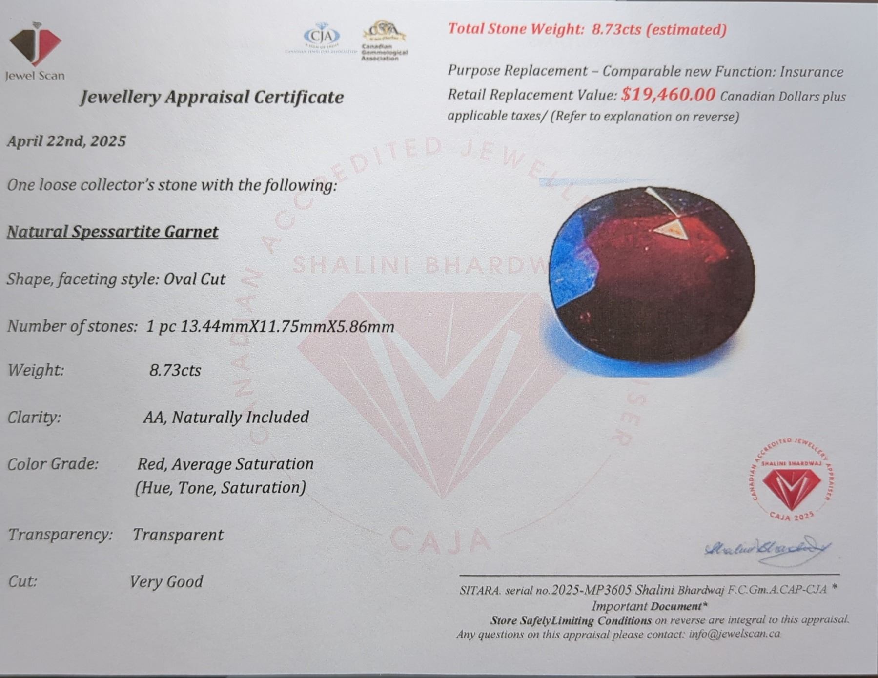 RARE - 8.73 CT CERTIFIED SPESSARTITE GARNET GEMSTONE ($19,460 APPRAISAL, APPRAISAL NOT GUARANTEED)