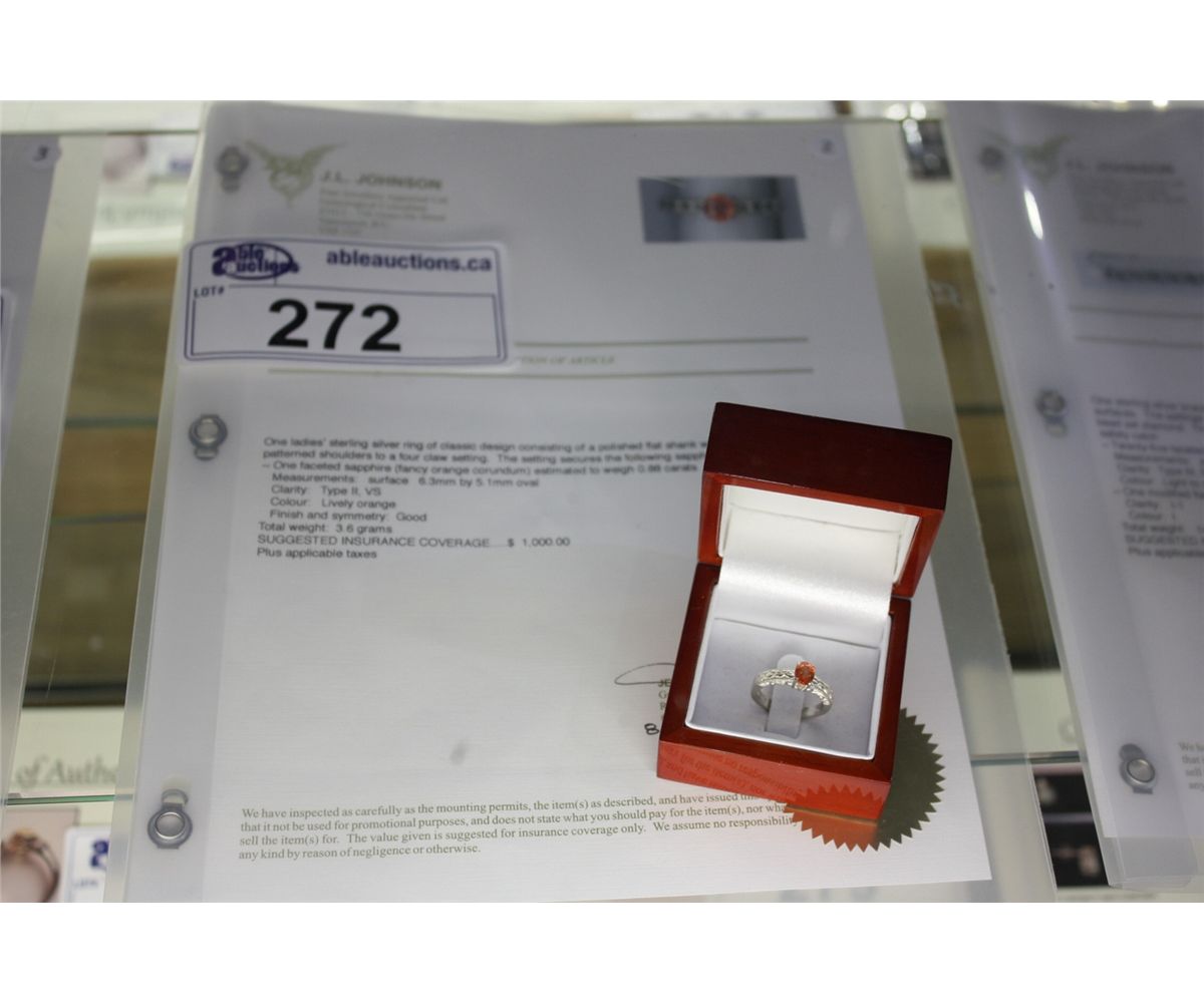 RARE ORANGE .88CARAT SAPPHIARE SOLITAIRE RING. INCLUDES GEMOLOGISTS APPRAISAL AT $1000
