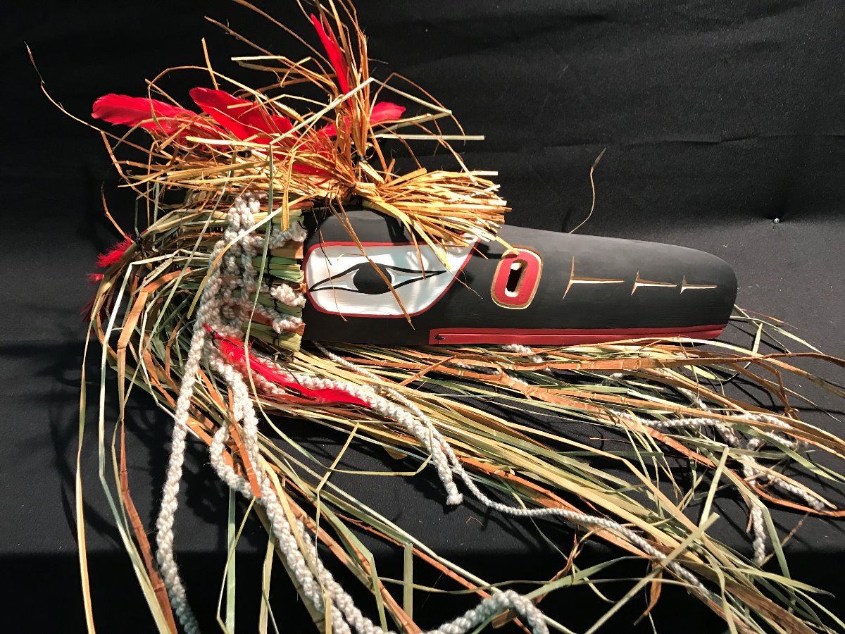 RAVEN MASK BY STO'LO NATION ARTIST ROBER THOMAS. MASK MEASURES 24" LONG AND 12"+ TALL WITH CEDAR BARK AND FEATHERS