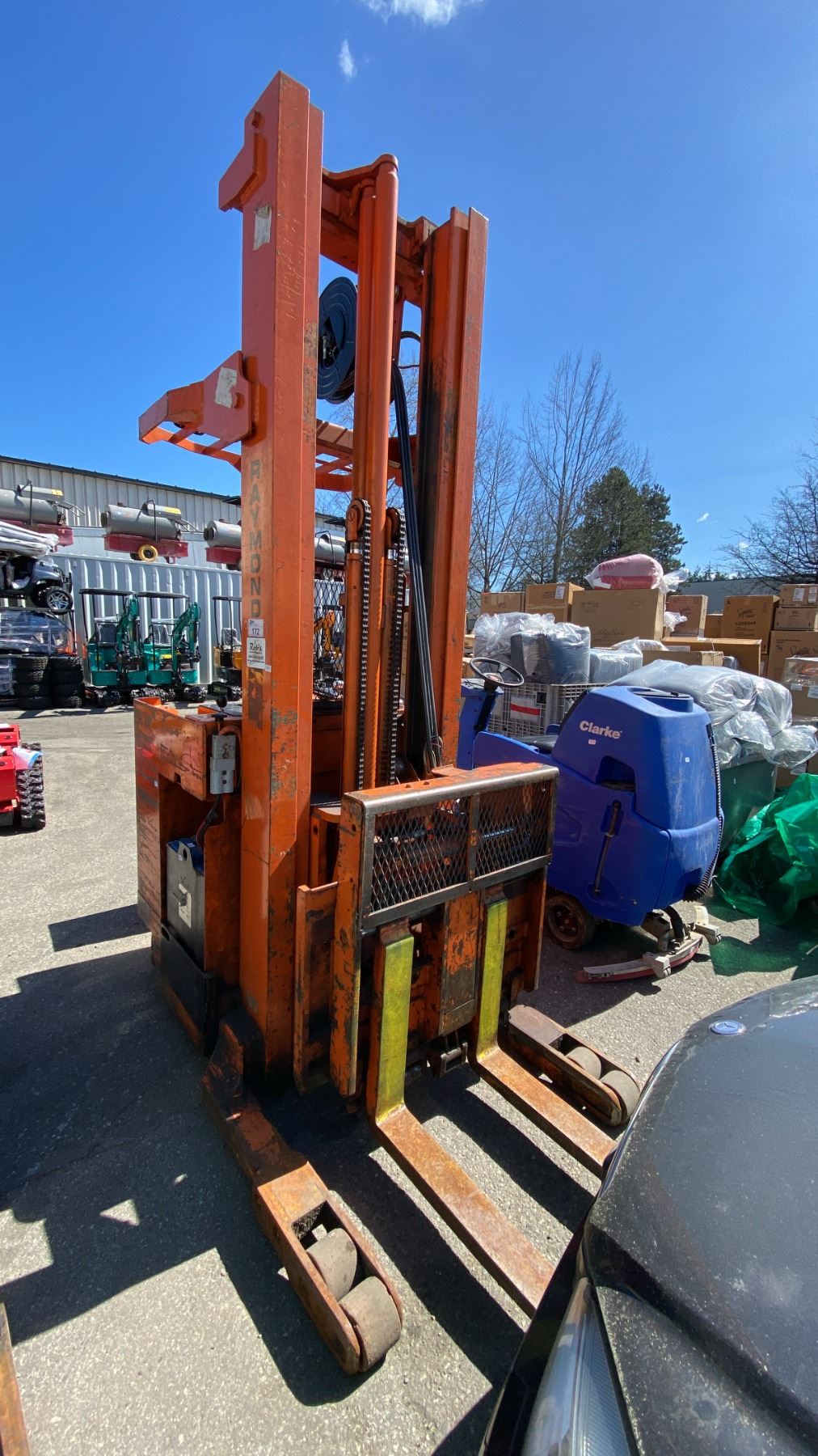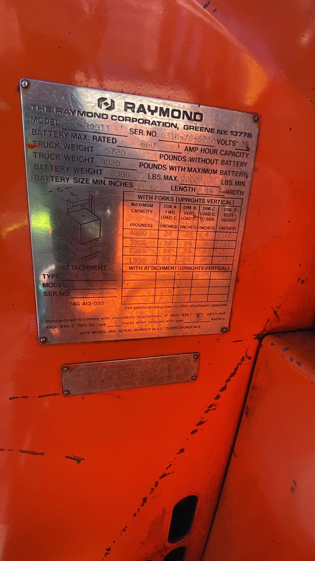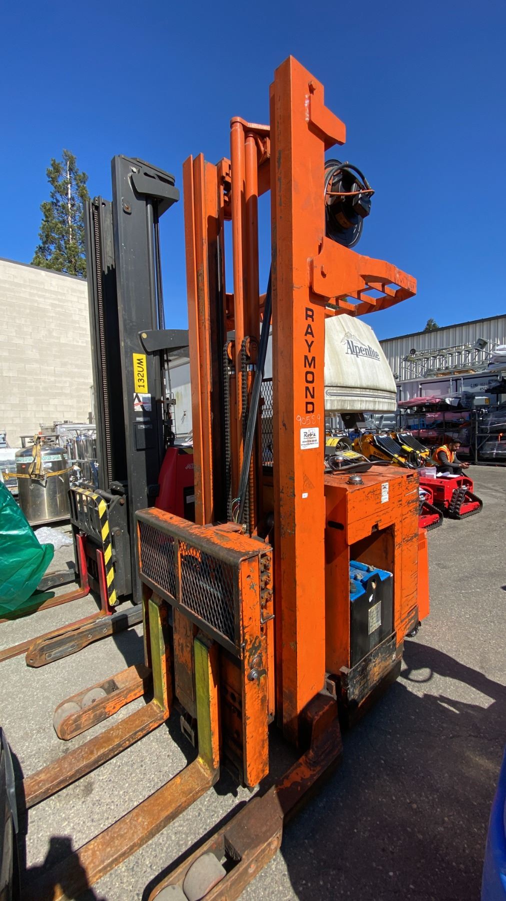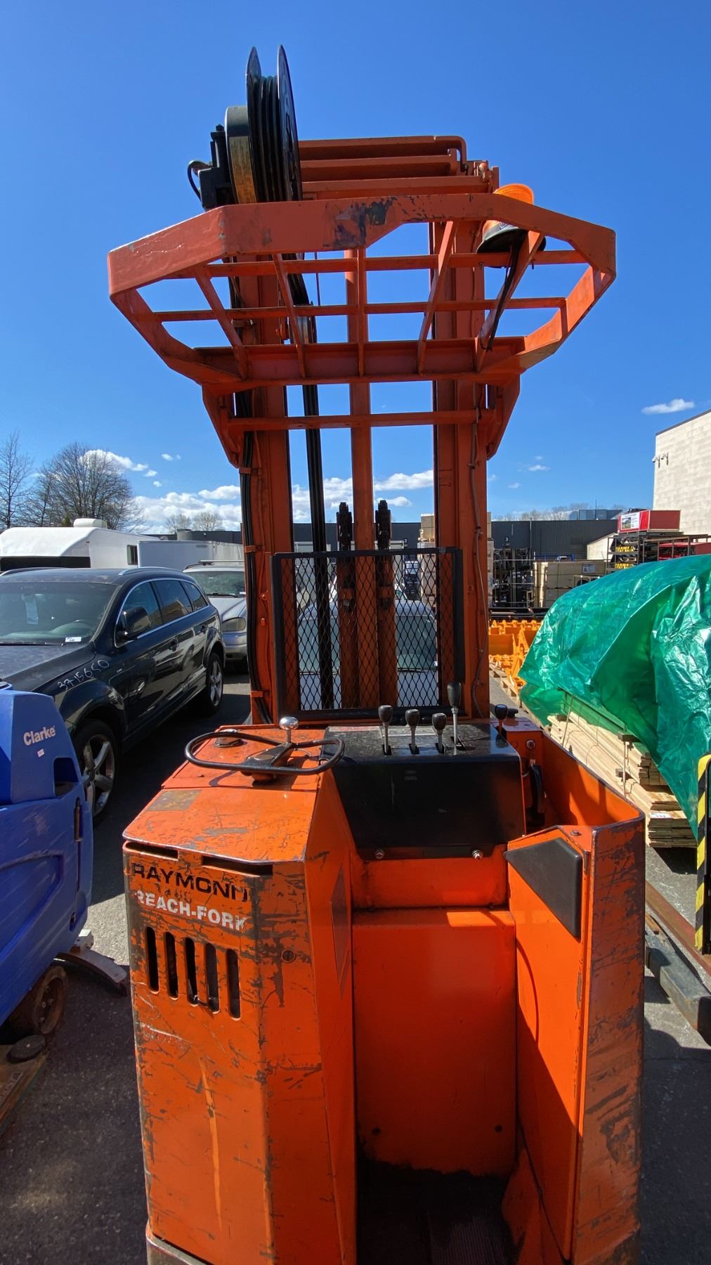 RAYMOND 31-R4OTT ORANGE 36V ELECTRIC STAND ON REACH TRUCK WITH CHARGER 3 STAGE MAST, 4000LB CAPACITY *NO CHARGE, RUNNING CONDITION UNKNOWN* *REQUIRES HIAB OR TILT DECK FOR REMOVAL*