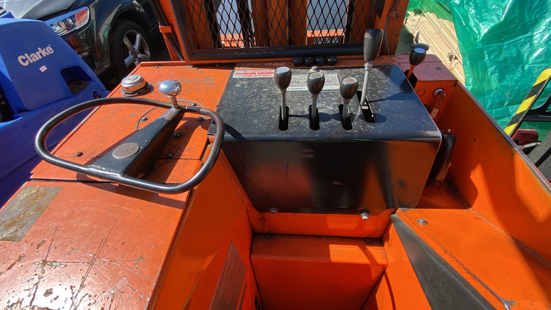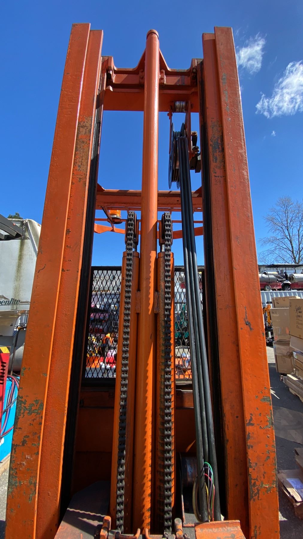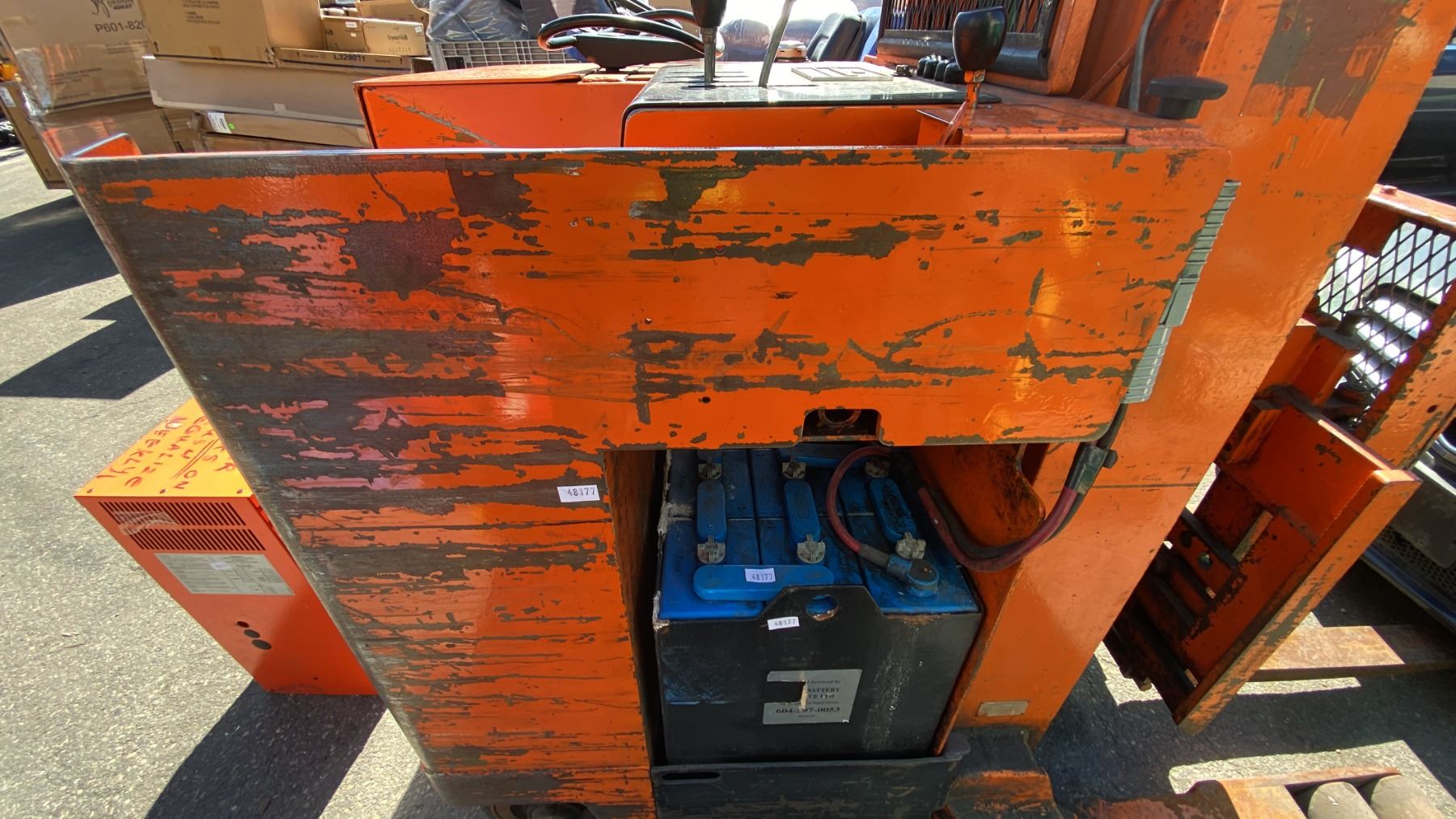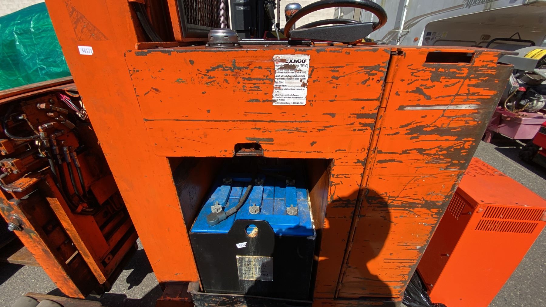 RAYMOND 31-R4OTT ORANGE 36V ELECTRIC STAND ON REACH TRUCK WITH CHARGER 3 STAGE MAST, 4000LB CAPACITY *NO CHARGE, RUNNING CONDITION UNKNOWN* *REQUIRES HIAB OR TILT DECK FOR REMOVAL*