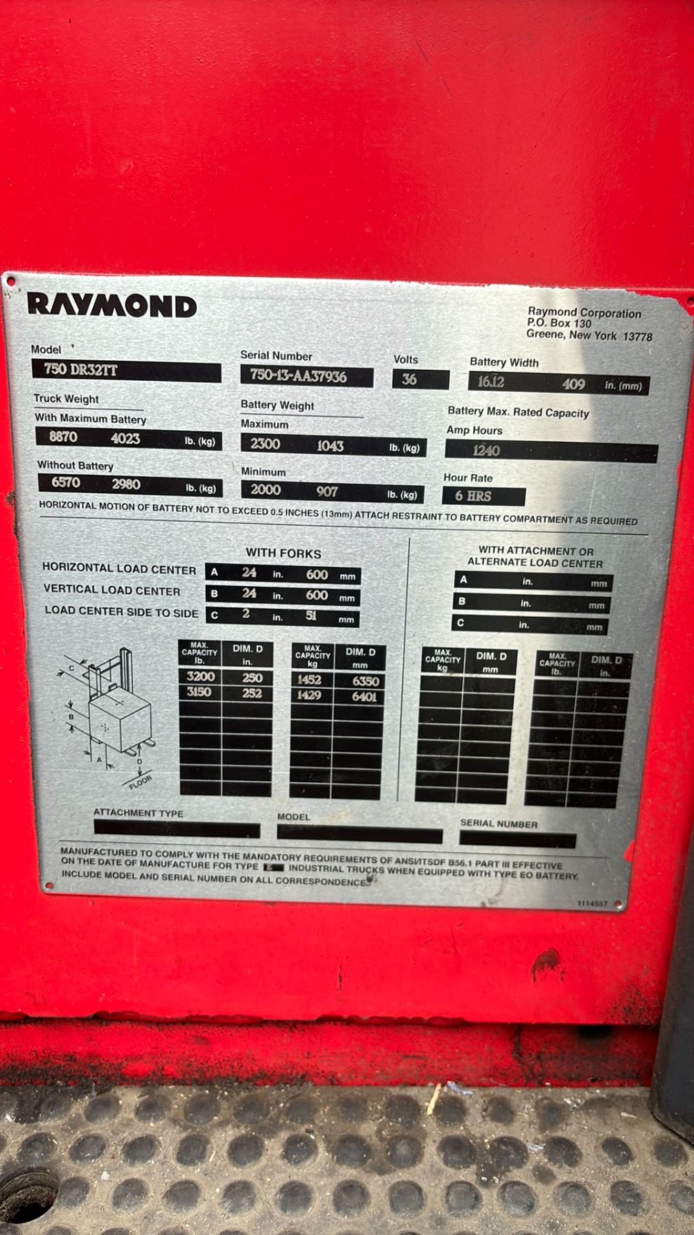 RAYMOND 750-DR32TT - 3 STAGE MAST, 3200 LB MAX CAPACITY ELECTRIC SIDE STAND DOCK TRUCK, WITH A MAST HEIGHT OF 250", 31,081 HRS (HOURS NOT VERIFIED) INCLUDES A ENERSYS IRONCLAD WORKHOG E125-13 BATTERY, 42"L FORKS & KEYS ( SERIAL # 750-13-AA37936 ) *FEATURES: GOES FORWARD, GOES IN REVERSE, RUBBER TIRES, BRAKES WORK, CHARGER NOT INCLUDED*