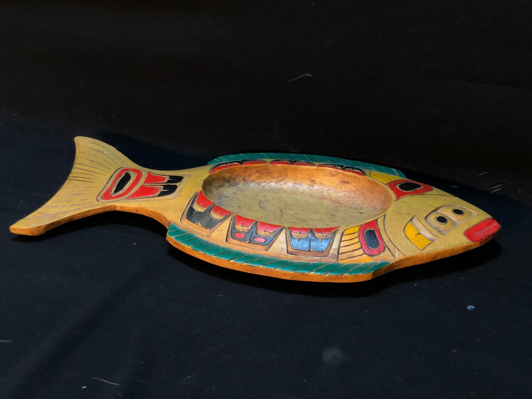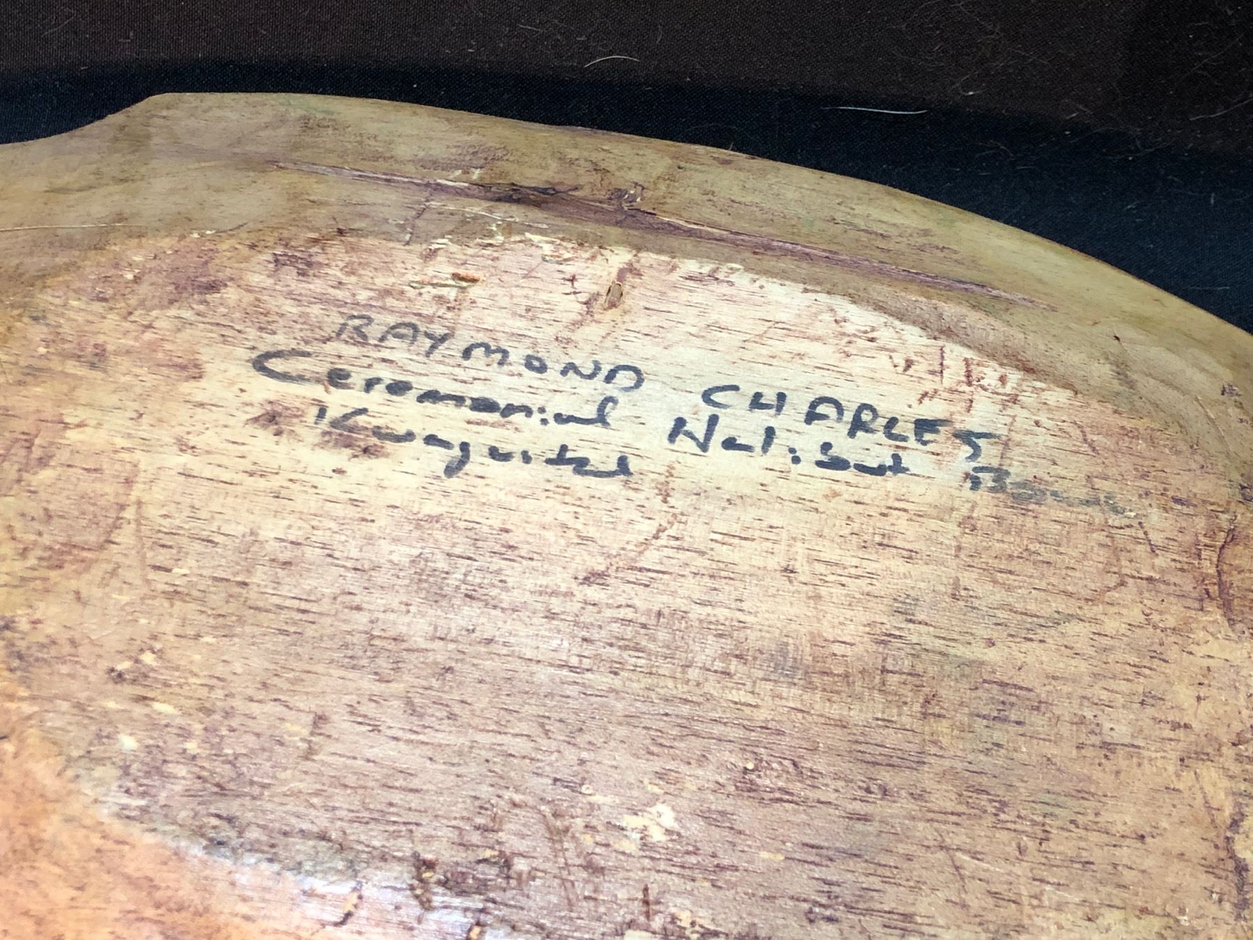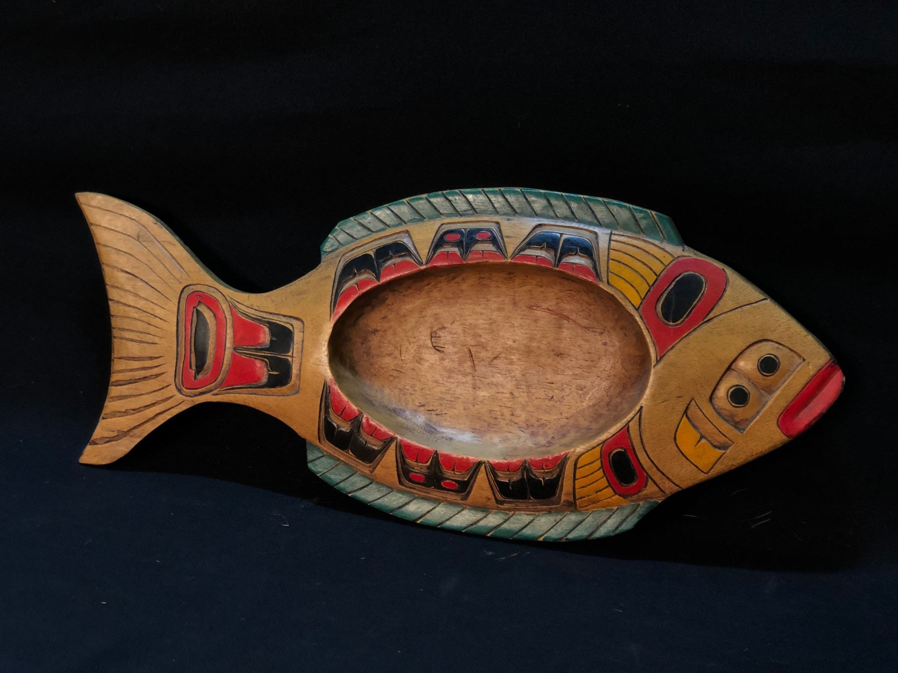 RAYMOND CHARLES "CEREMONIAL HALIBUT BOWL" HAND CARVED AND PAINTED KWAGIUTL BOWL, SIGNED ON BOTTOM BY ARTIST, APPROX. 20'' LONG