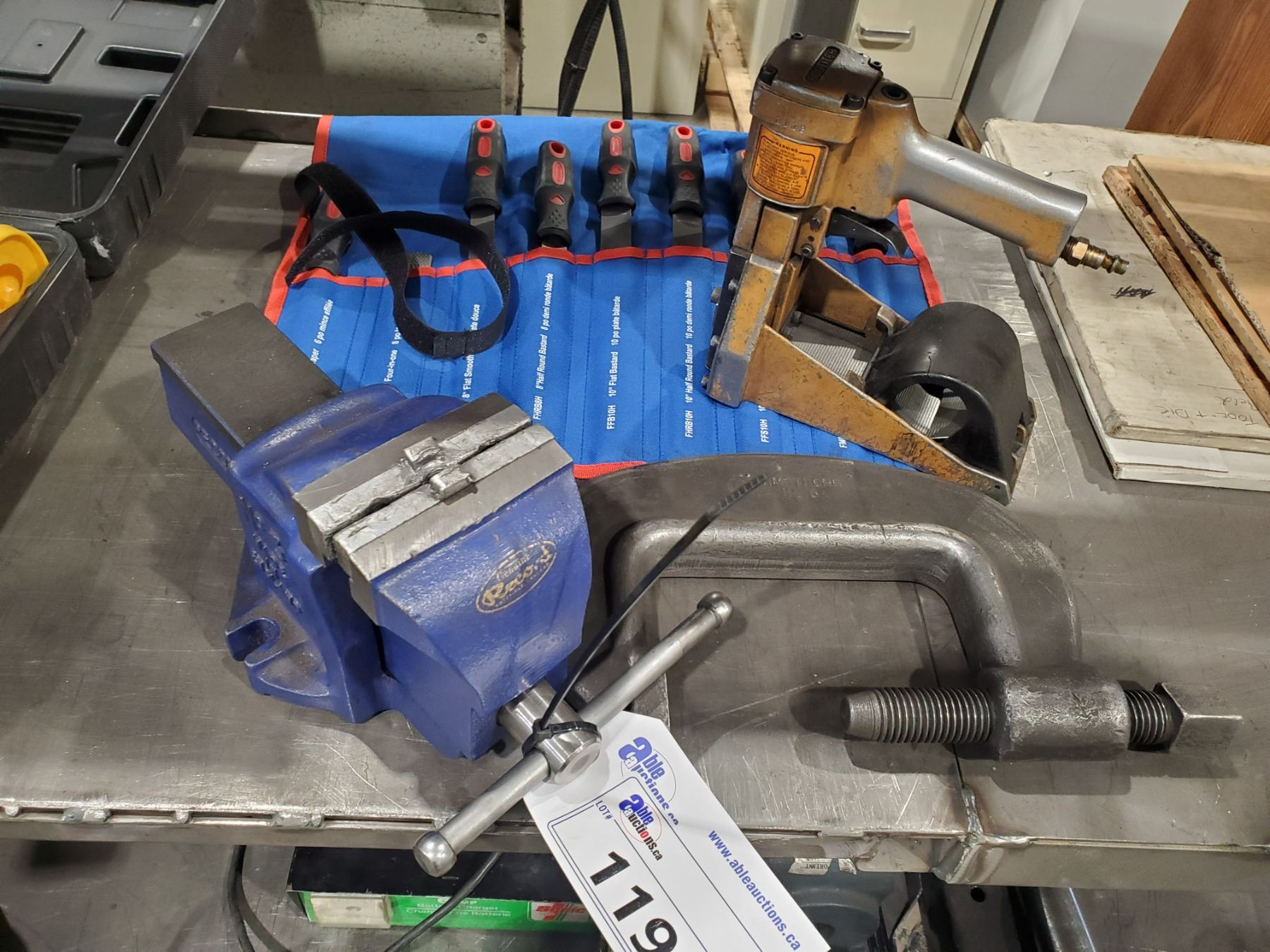 RECORD NO.3 BENCH VICE, WESTWARD 9PC FILE SET, LARGE ALUMINIUM C-CLAMP & BOSTITCH BOX STAPLER