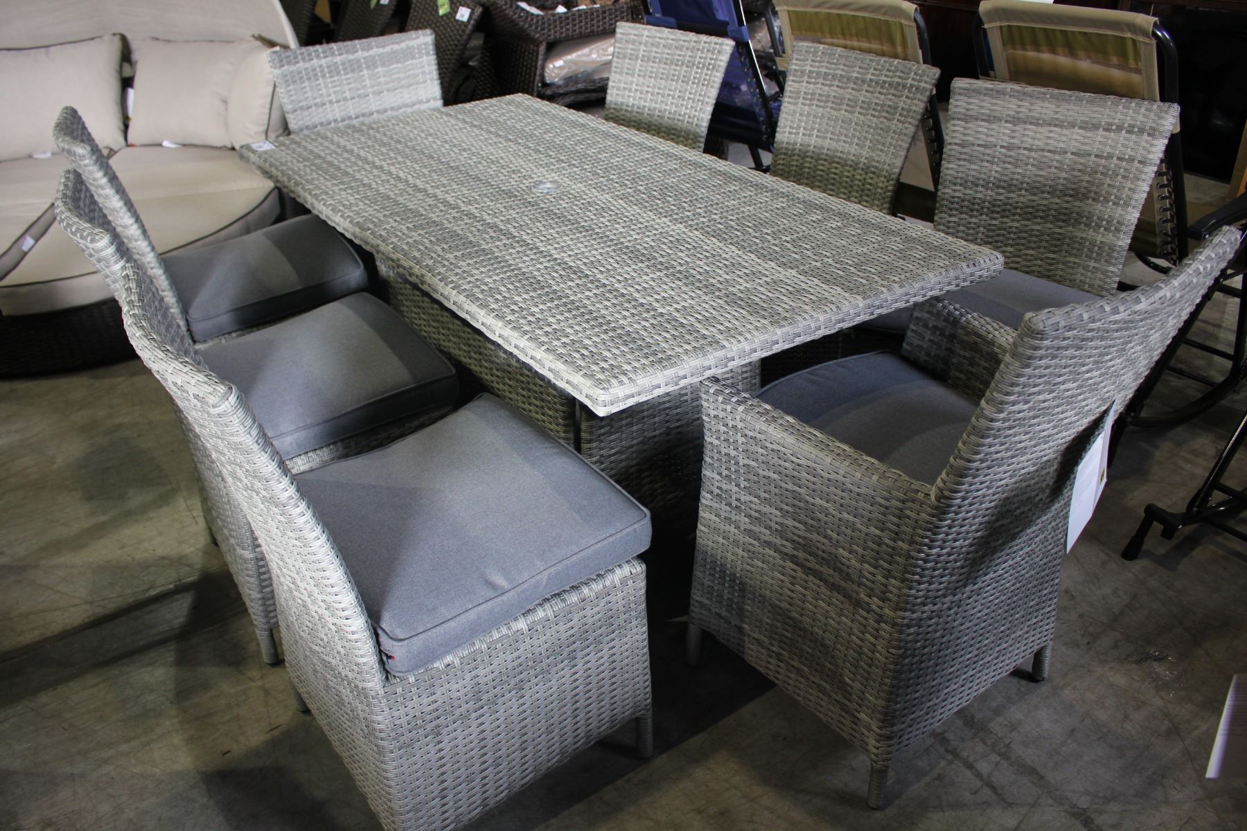 RECTANGULAR PATIO DINING TABLE WITH EIGHT CHAIRS - GREY CUSHIONS