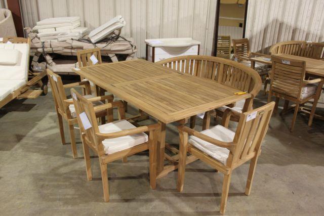 RECTANGULAR TEAK PATIO TABLE & 4 ARMCHAIRS WITH CUSHIONS & CURVE BACK BENCH