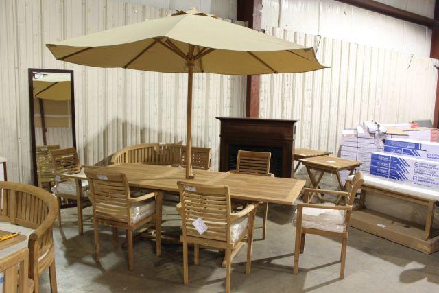 RECTANGULAR TEAK PATIO TABLE & 6 ARMCHAIRS WITH CUSHIONS & UMBRELLA