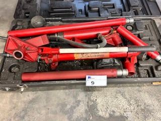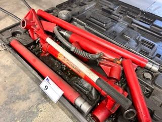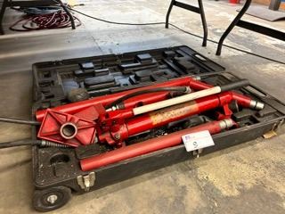 RED 10 TON CAPACITY HYDRAULIC BODY FRAME JACK WITH ASSORTED ATTACHMENTS IN HARD CASE