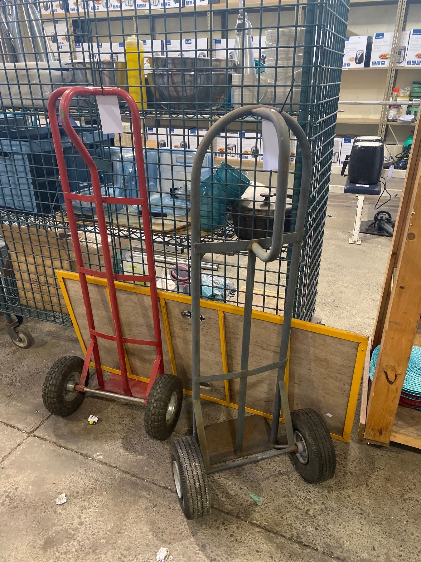 RED 2 WHEEL DOLLY, AND GREY 2 WHEEL DOLLY, AND CARRY BOARD