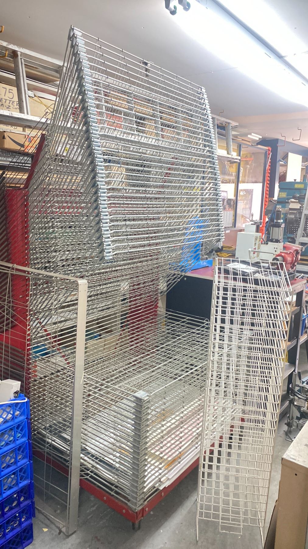 RED 50 RACK MOBILE PRINT SHOP DRYING RACK - APPROX. 4'W X 4'D X 6.5'H AND A SMALL WHITE 4.5'H PRINT SHOP DRYING RACK