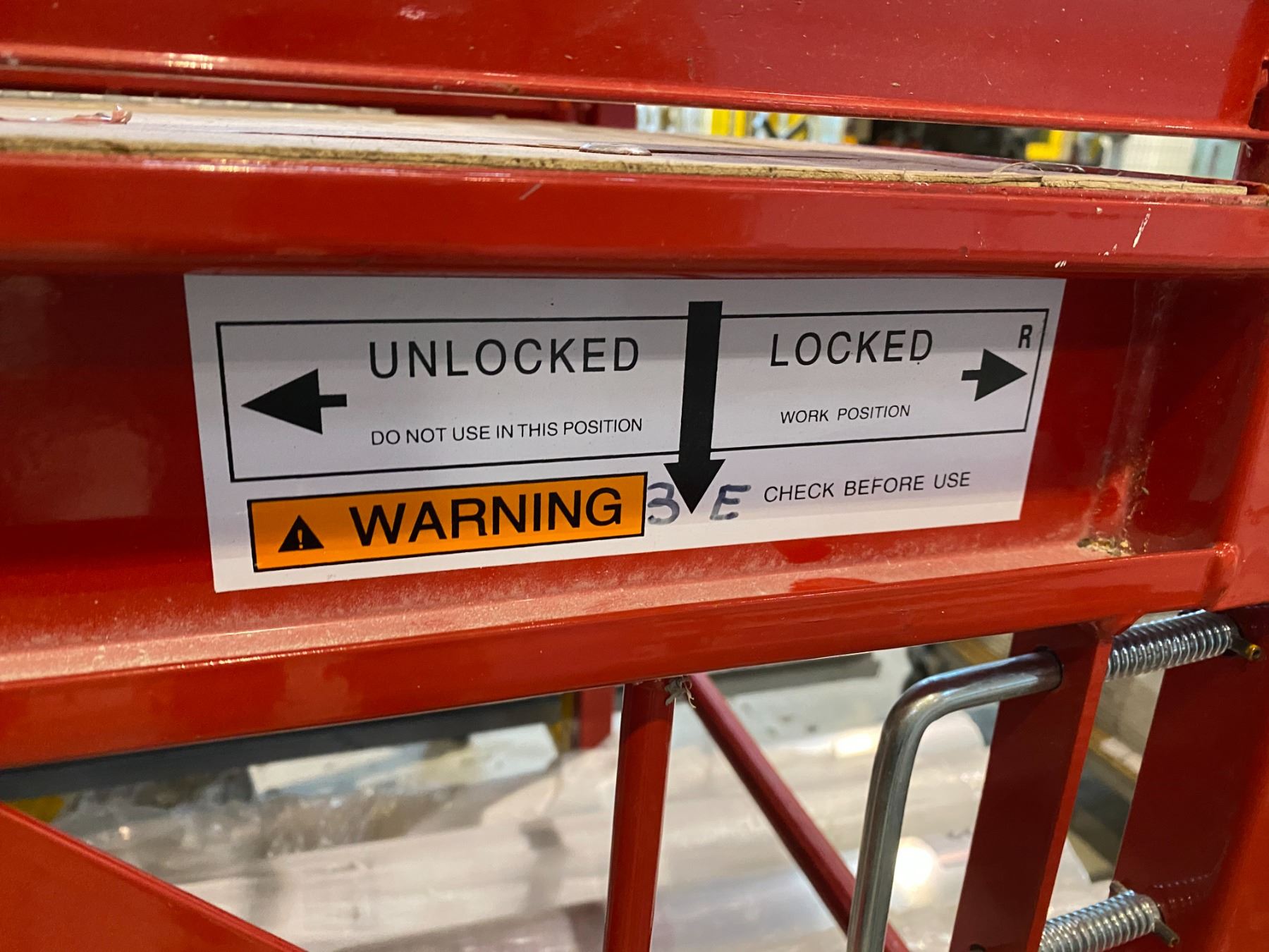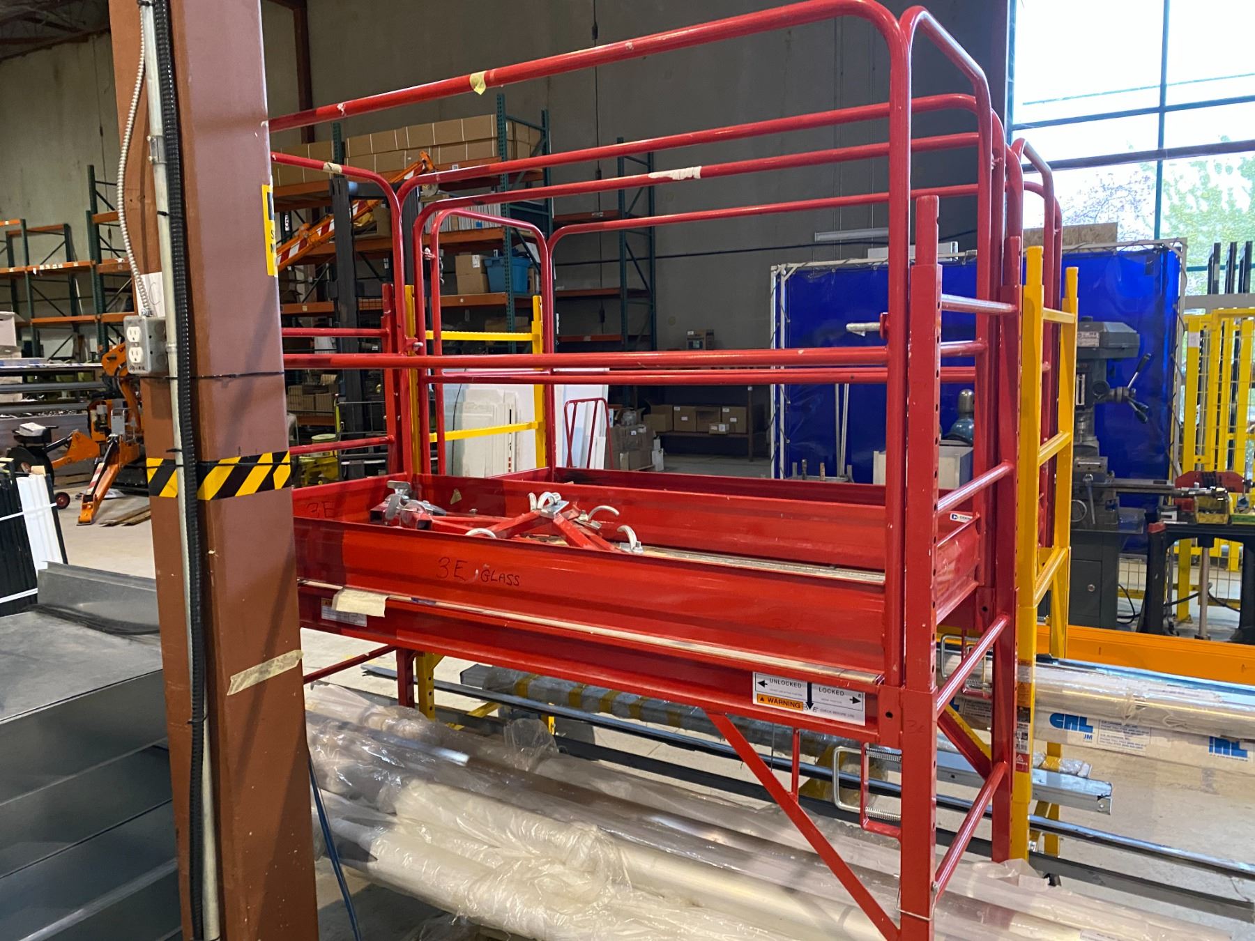 RED 74"W X 30"D ADJUSTABLE HEIGHT ROLLING SCAFFOLD WITH SAFETY CAGE AND OUTRIGGERS