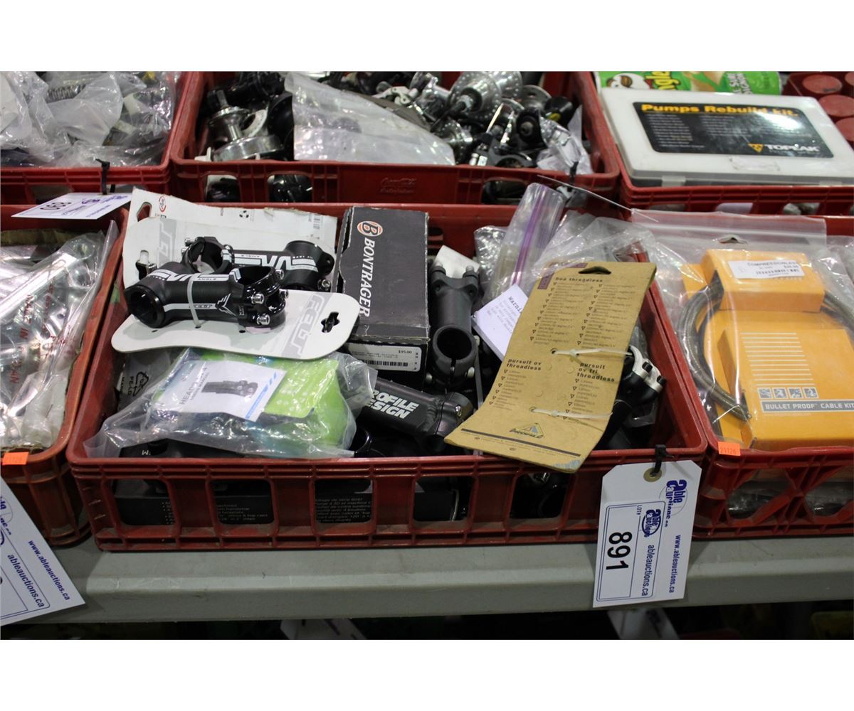 RED BIN WITH ASSORTED BIKE PARTS