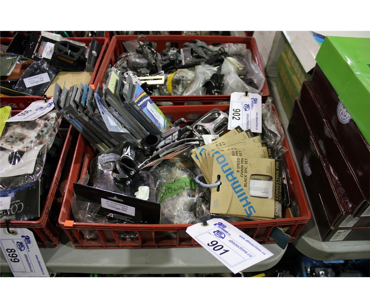RED BIN WITH ASSORTED BIKE PARTS