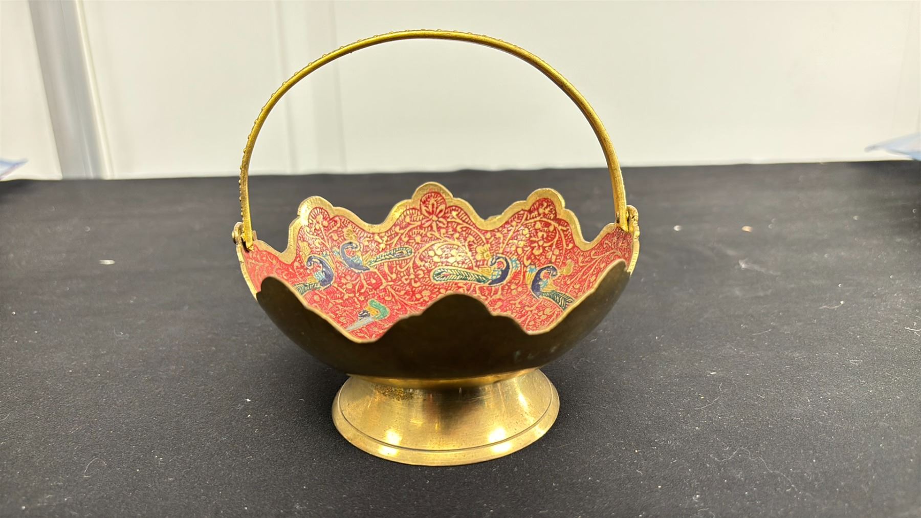 RED ENAMEL PEACOCK BOWL W HANDLE