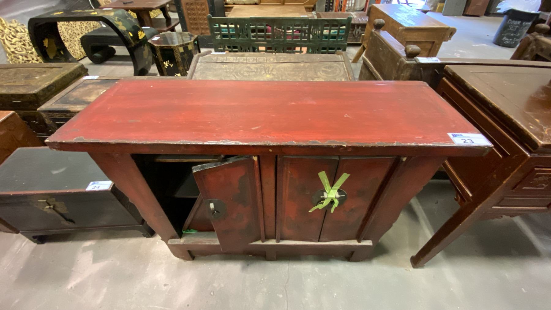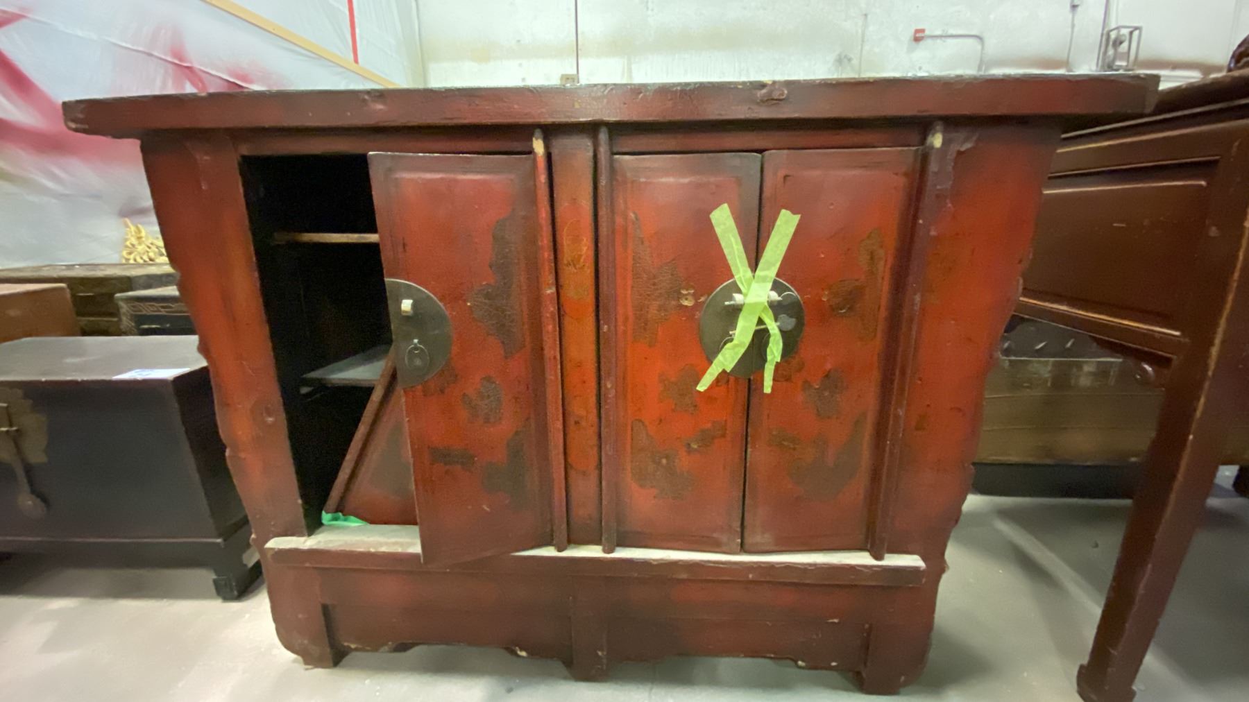 RED FINISH HARDWOOD 4 DOOR SMALL ASIAN CABINET * ONE DOOR NEEDS REASSEMBLING*