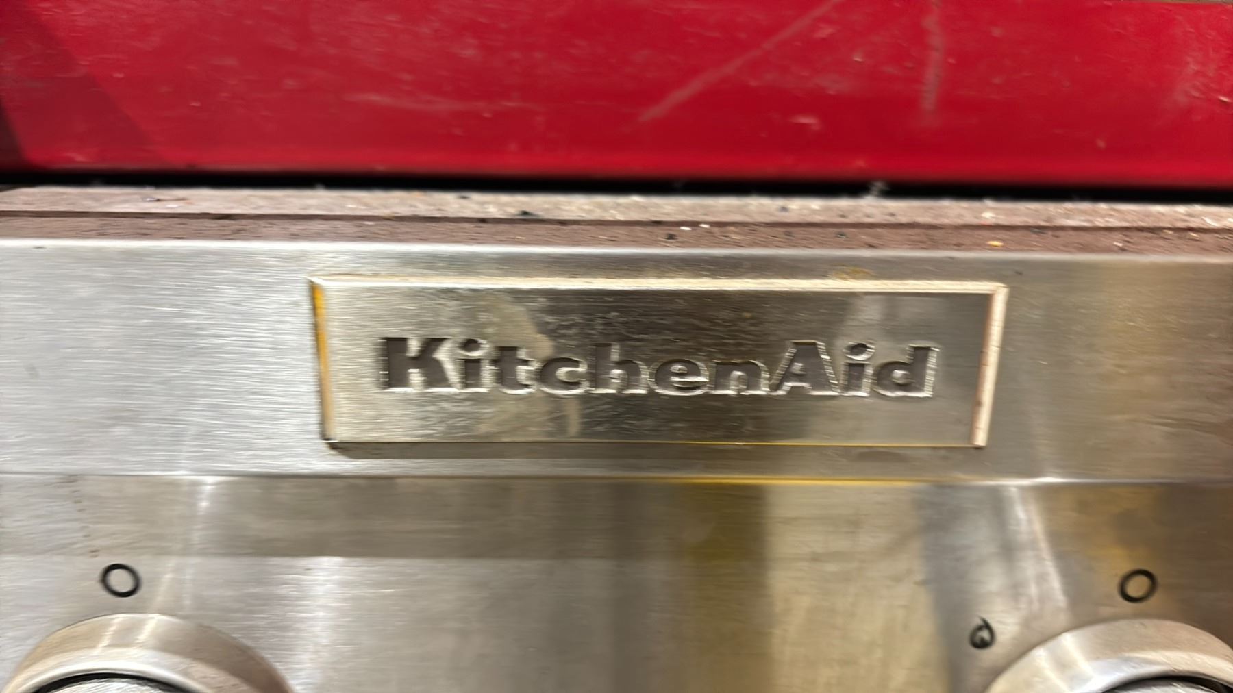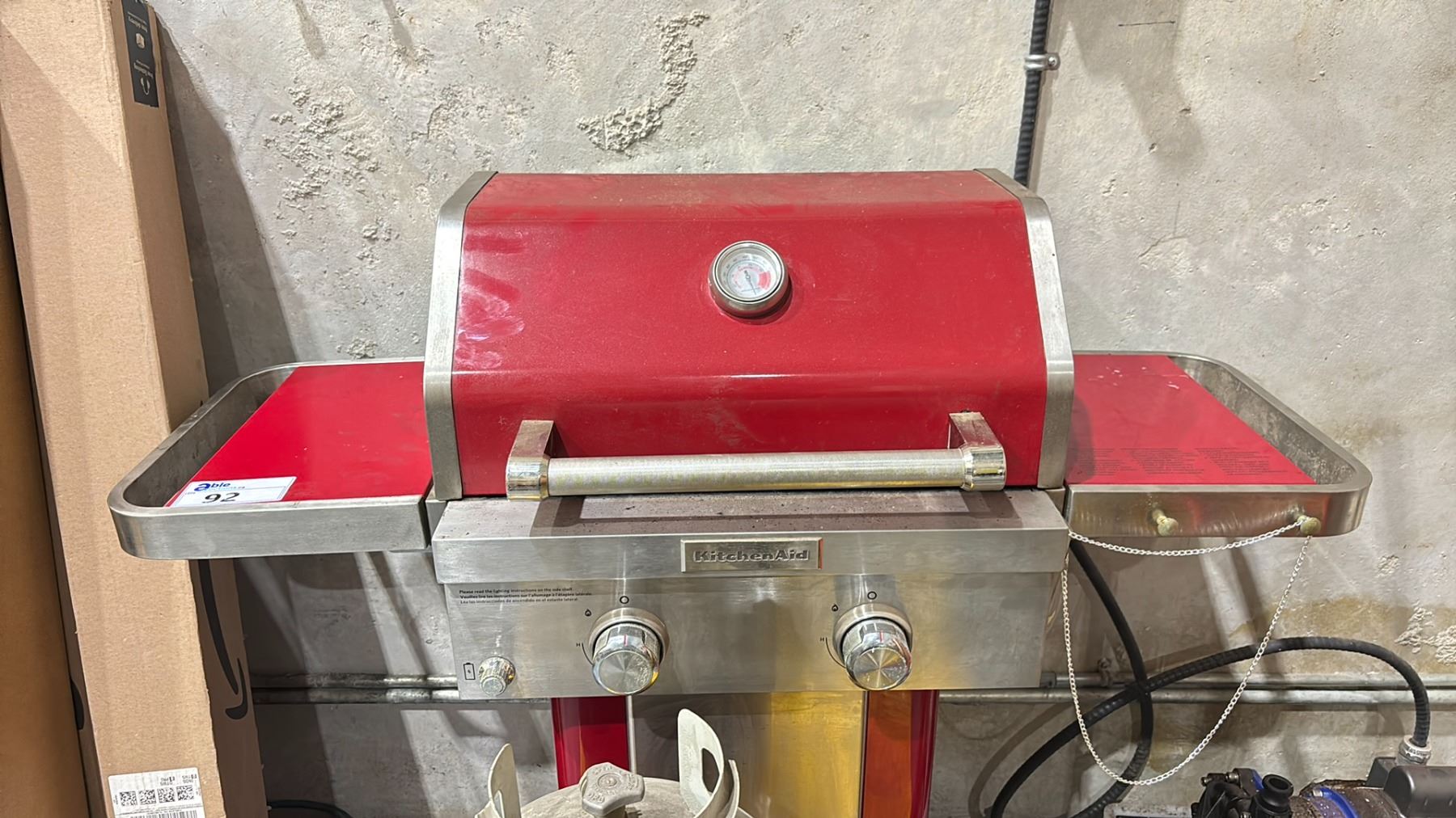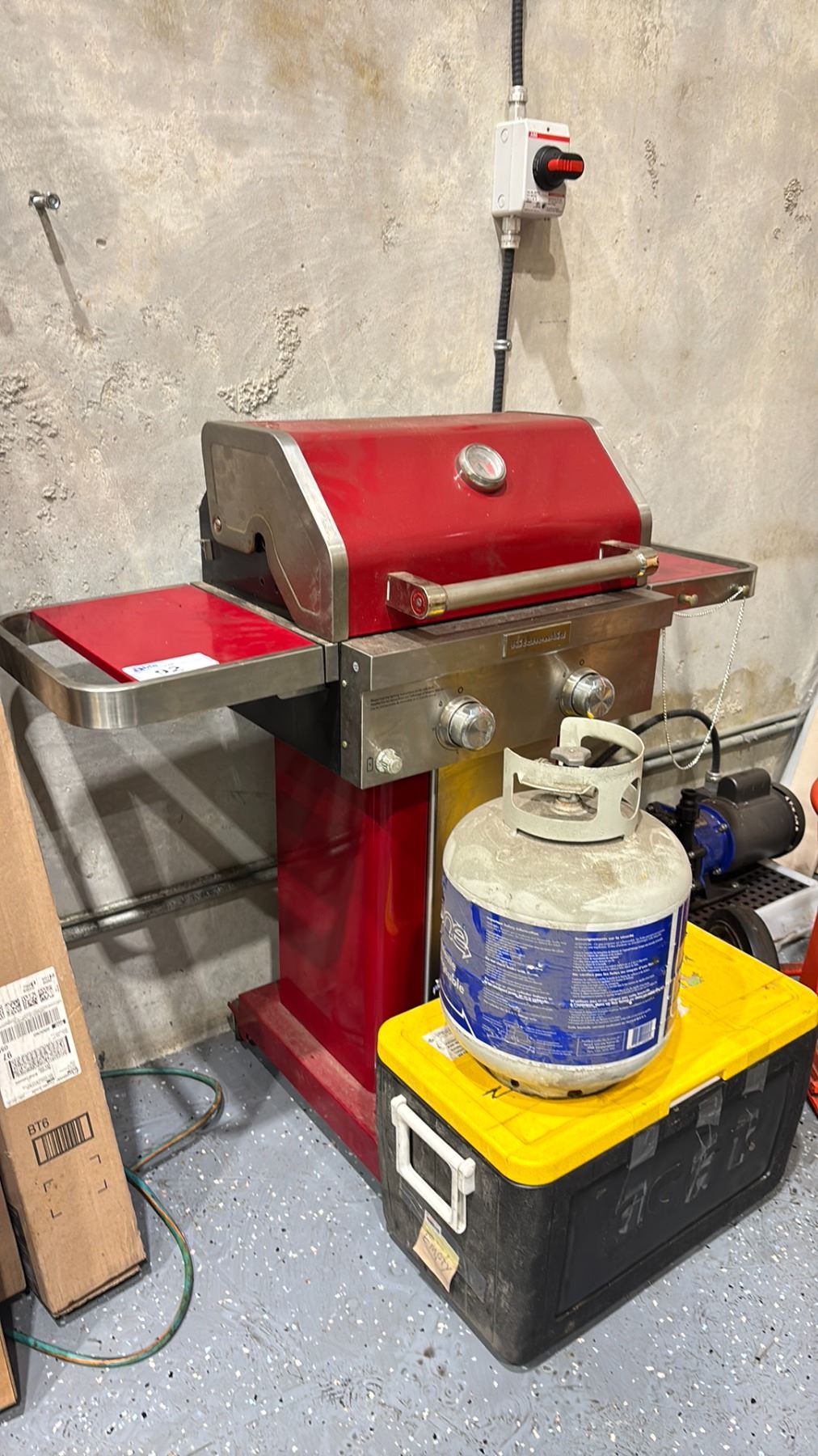 RED KITCHEN AID 21" BARBEQUE, PROPANE TANK & A BLACK/YELLOW COOLER