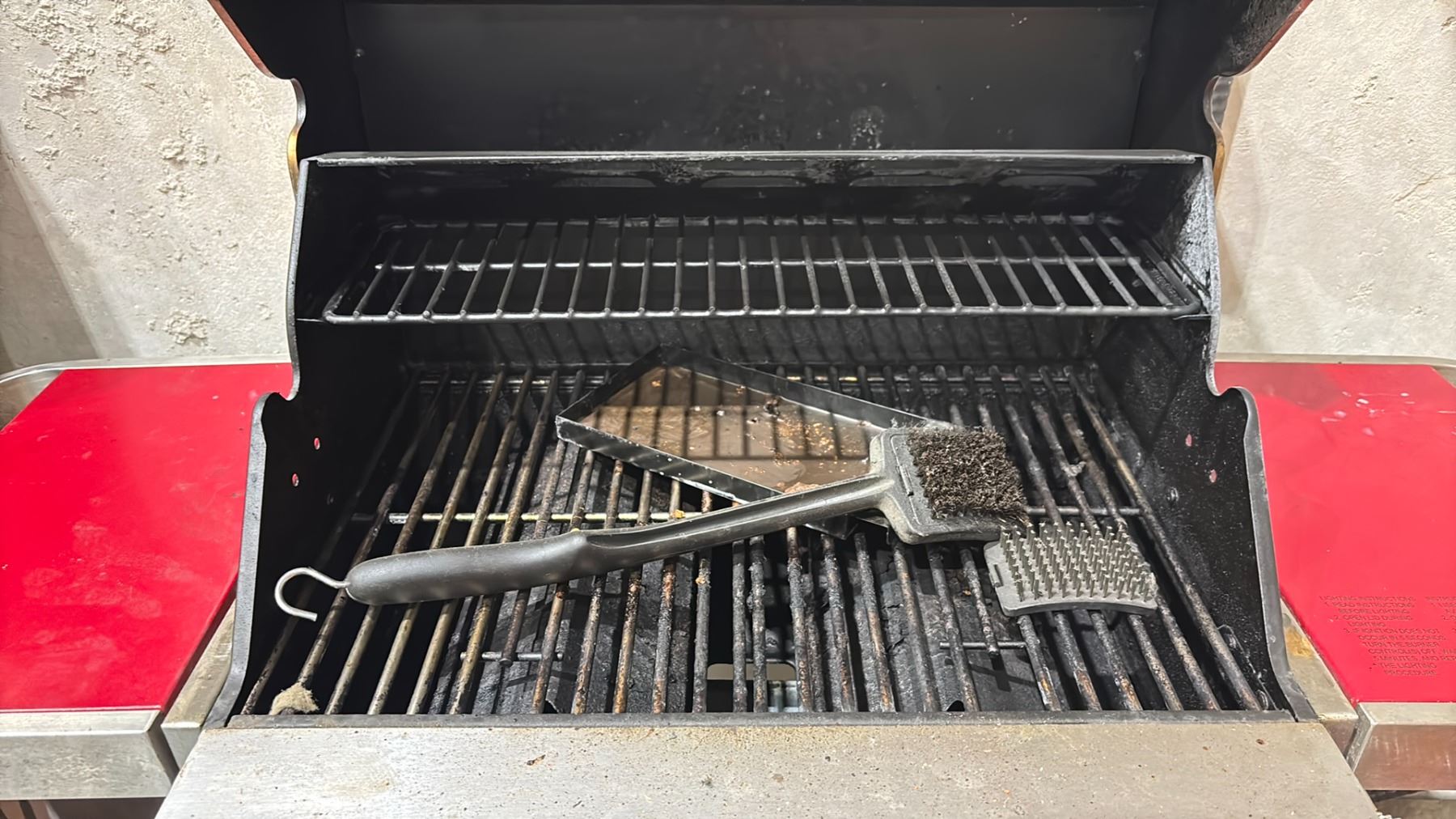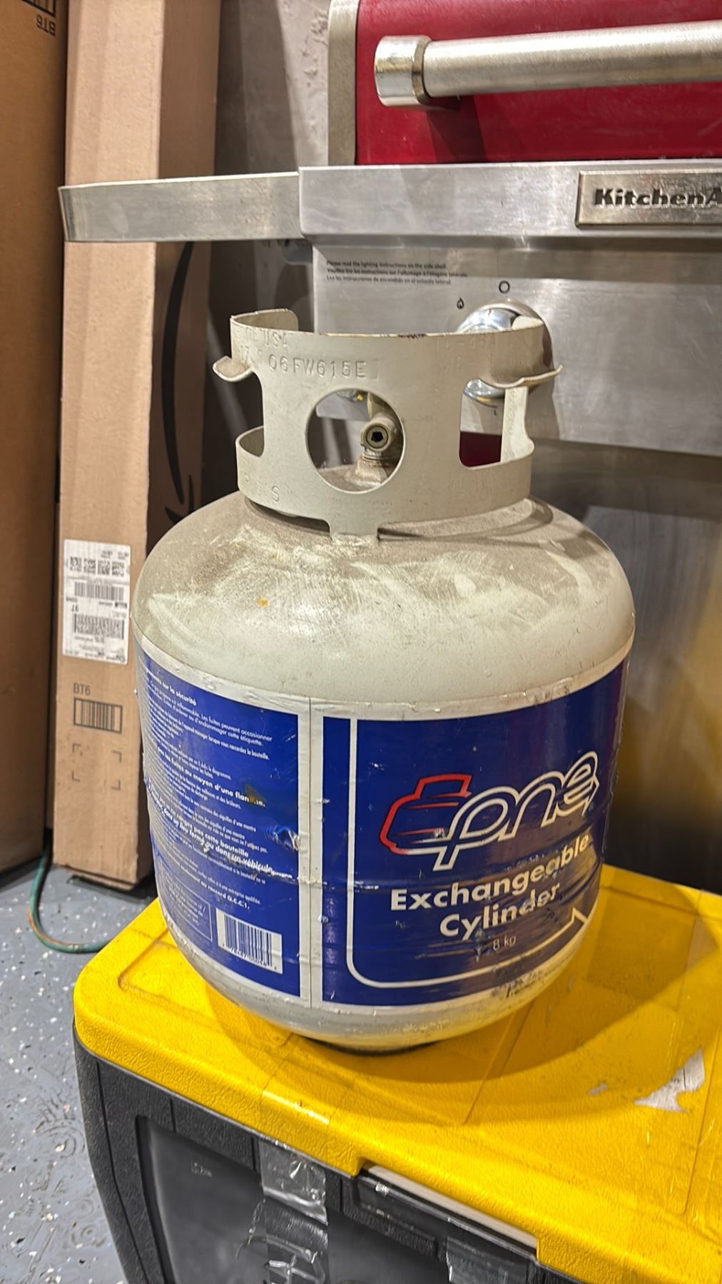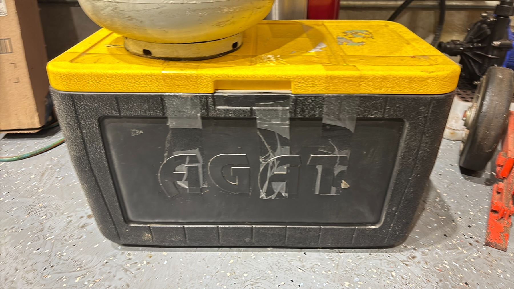 RED KITCHEN AID 21" BARBEQUE, PROPANE TANK & A BLACK/YELLOW COOLER