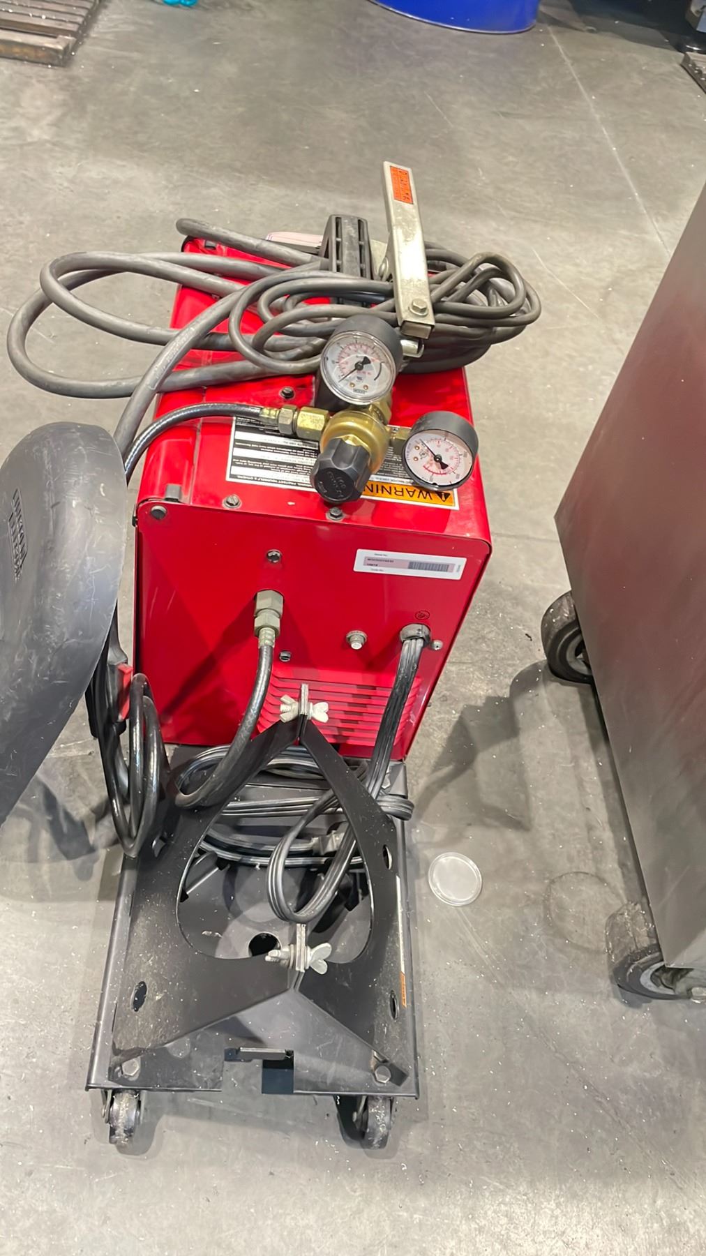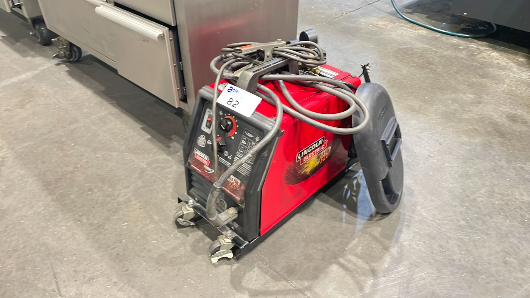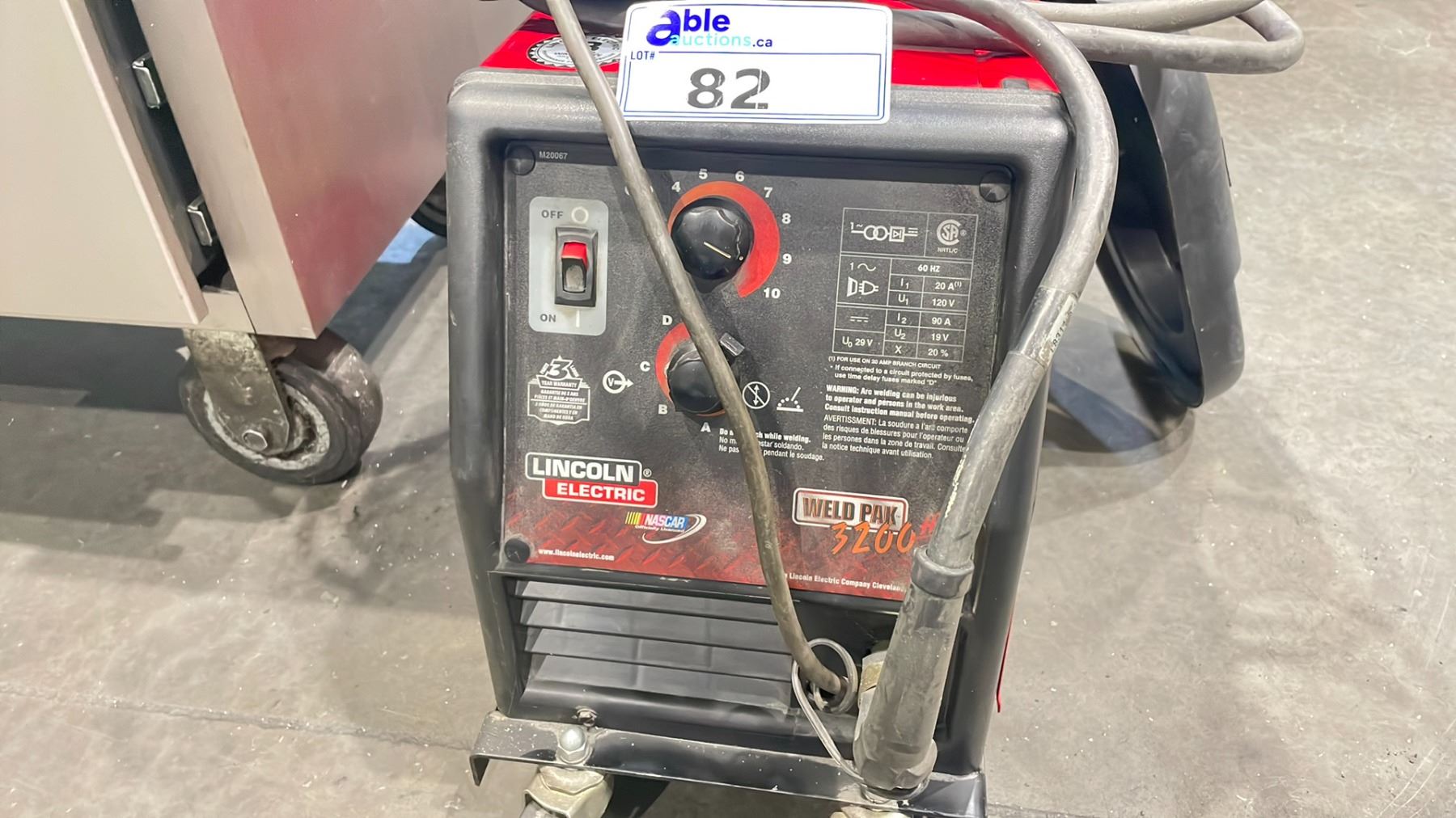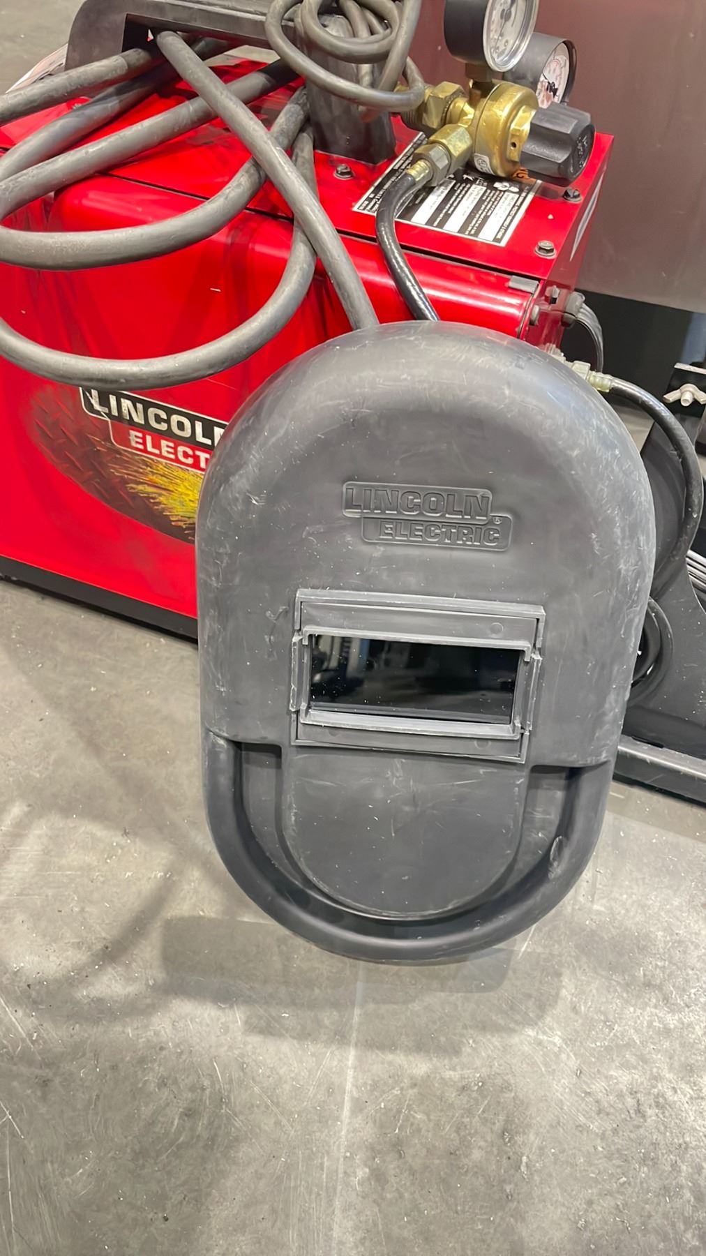 RED LINCOLIN ELECTRIC WELDER WELD PAK 3200HD WIRE FEED WITH STINGER GROUND CABLE AND GAUGES. AN HAND HELD WELDING SHIELD