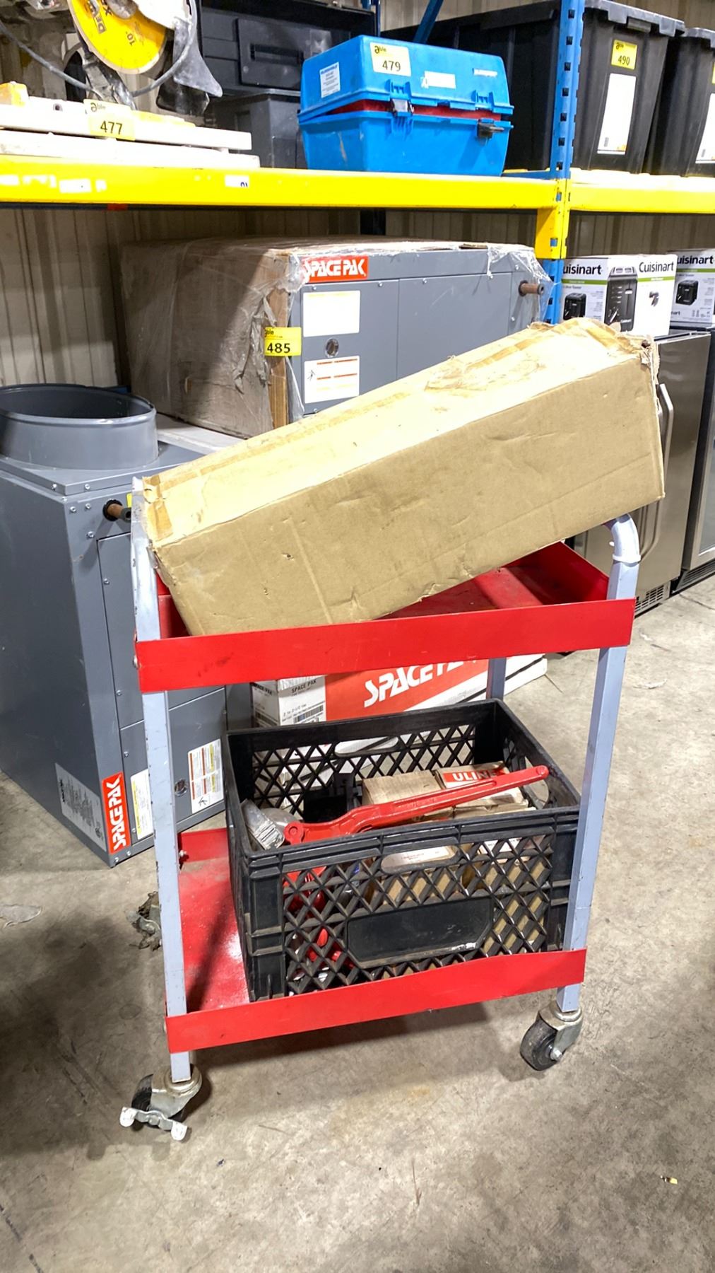 RED METAL 2 TIER MOBILE TOOL CART WITH BOX OF PAMFAST SUB FLOOR SCREWS, ULINE METAL POWDER SOAP DISPENSERS, AIR REGULATOR, & CHAIN SINCH