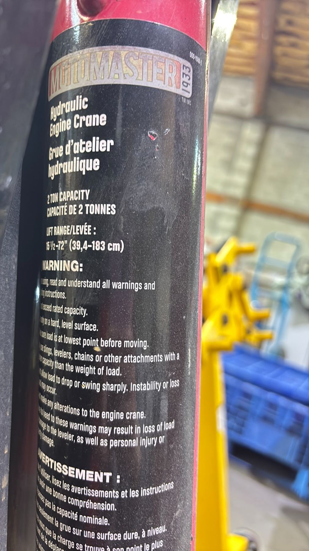 RED MOTOMASTER HYDRAULIC ENGINE CRANE WITH A 2 TON CAPACITY