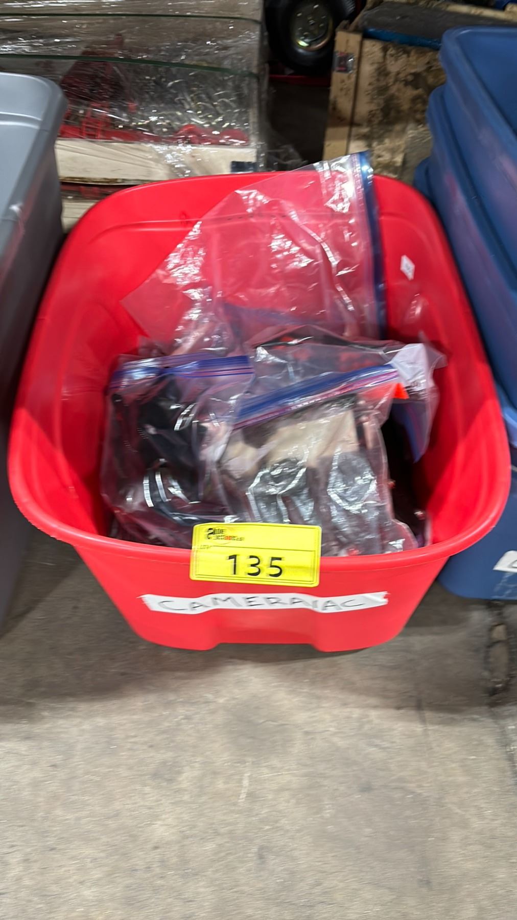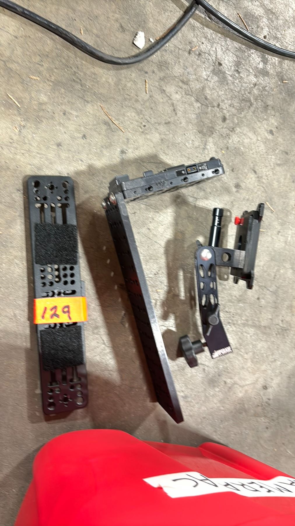 RED PLASTIC BIN OF ASSORTED DSLR CAMERA MOUNTS / MOUNTING PLATES / VESA MOUNTS / STABILIZATION HANDLES / DOUBLE ARTICULATED VERSA MOUNTS & ASSORTED CAMERA STABILIZATION EQUIPMENT *PLASTIC BIN INCLUDED*