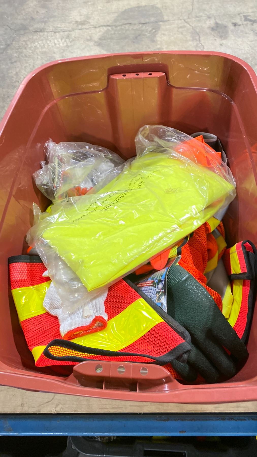 RED PLASTIC BIN OF ASSORTED GLOVES & HIGH VIABILITY VESTS *BIN INCLUDED*