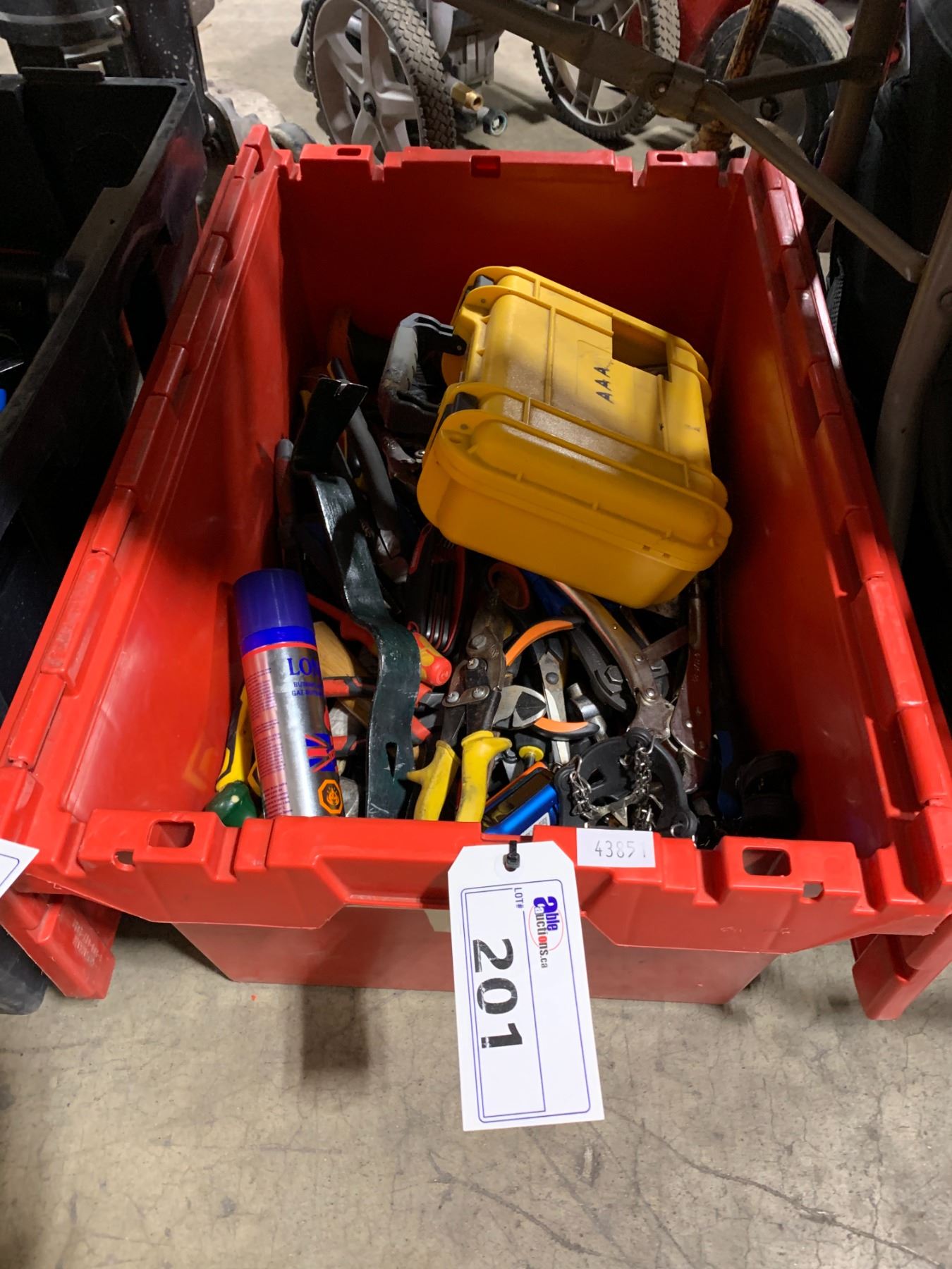 RED PLASTIC BIN OF ASSORTED HAND TOOLS
