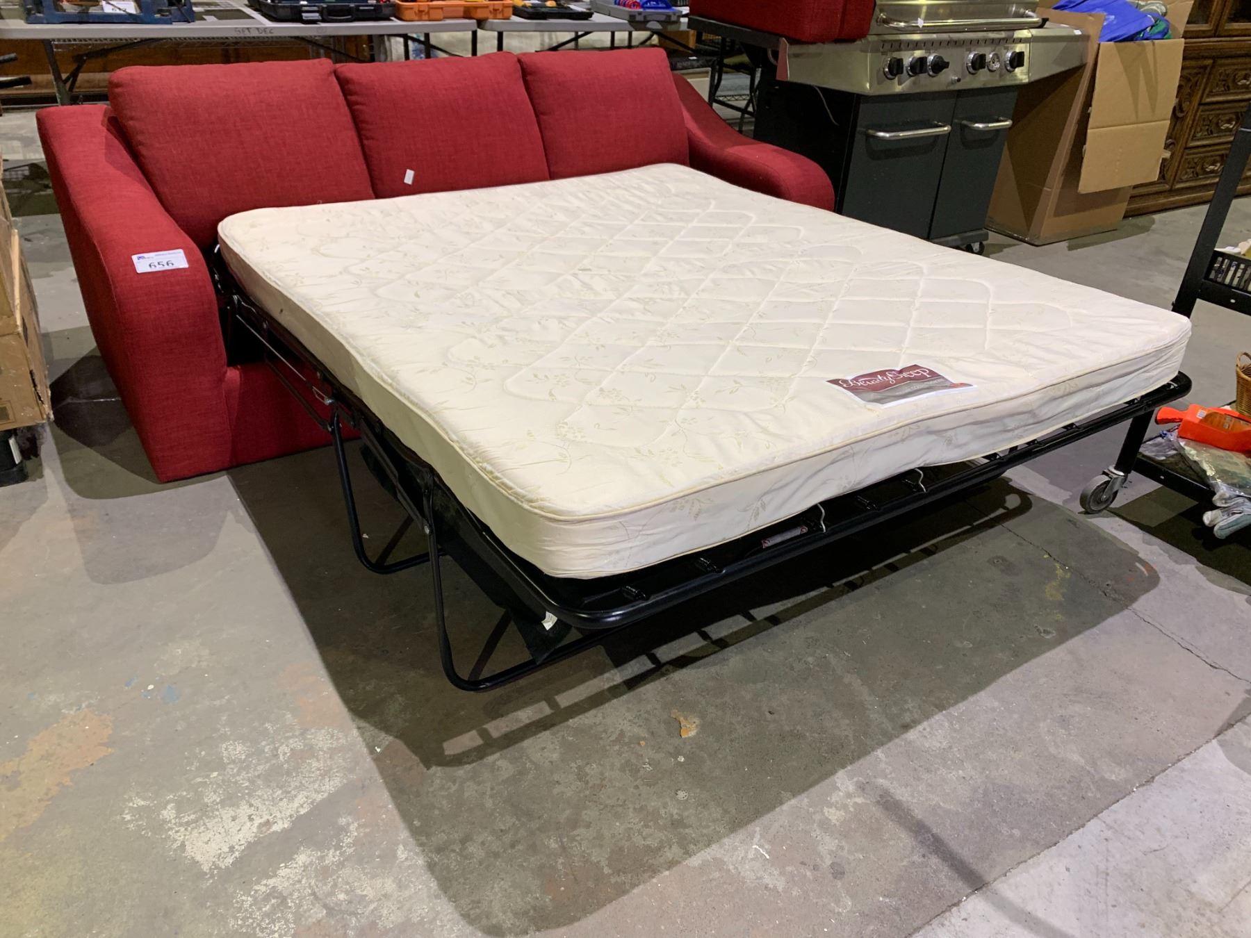 RED QUEEN SIZE SOFA BED- LEGS UNATTACHED