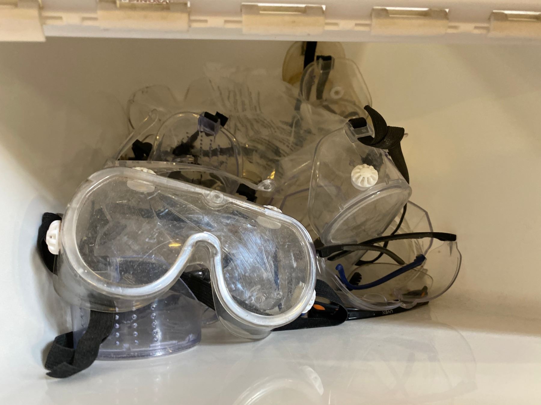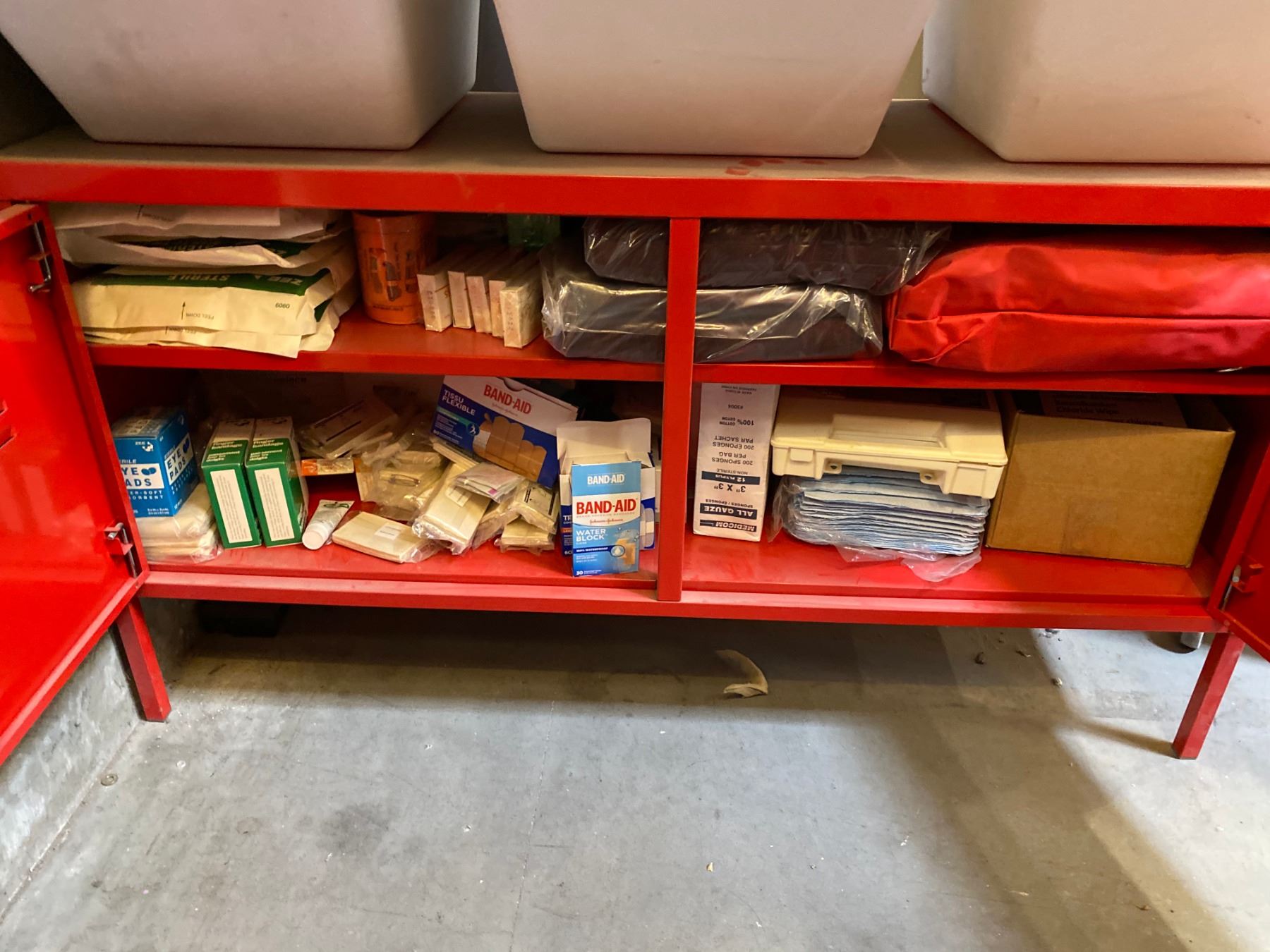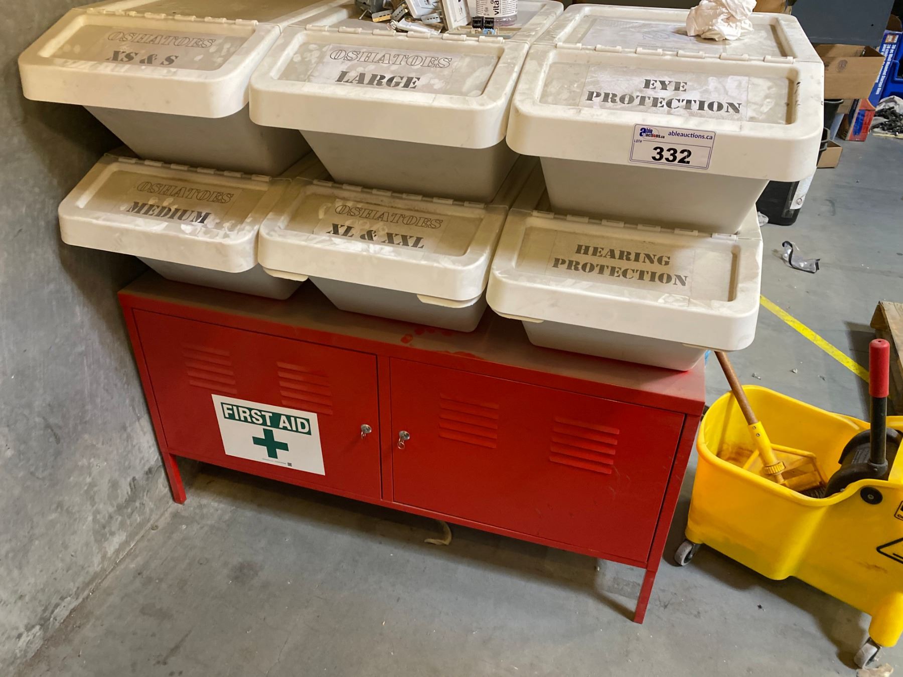 RED SAFETY SUPPLY CABINET AND 6 BINS OF PROTECTIVE EQUIPMENT